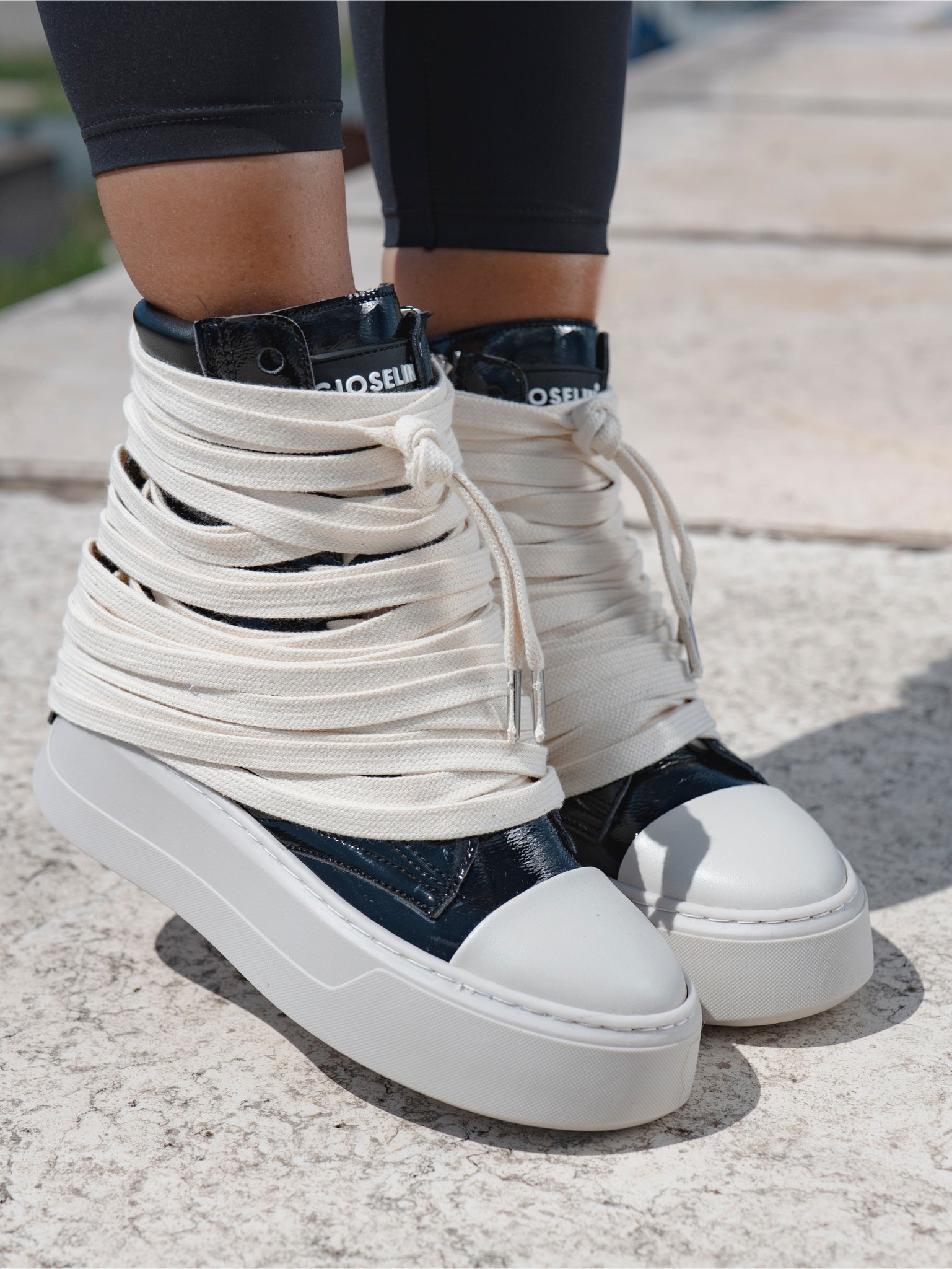 Realizzato in vernice nera lucida, dal finish ultra glam, questo stivale è una vera dichiarazione di carattere. La tomaia effetto glossy riflette la luce con eleganza e rende ogni passo protagonista.