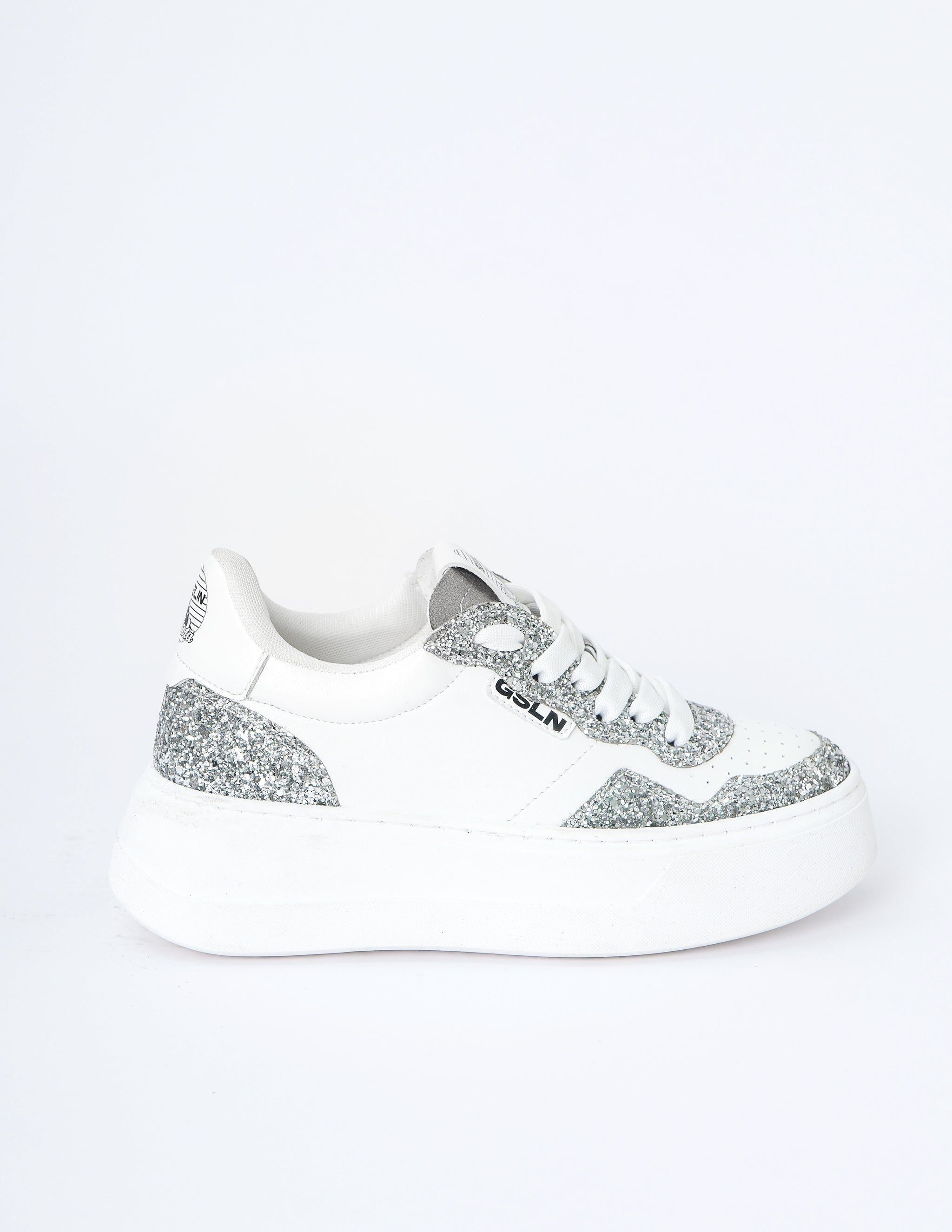 La tomaia bianca, luminosa e pulita, viene impreziosita da un profilo scintillante in glitter argento che abbraccia la silhouette con un movimento fluido e femminile. Ogni passo si trasforma in un riflesso di stile, mentre la suola platform ultra leggera regala slancio, comfort e un’elevazione naturale che accompagna il piede con leggerezza.