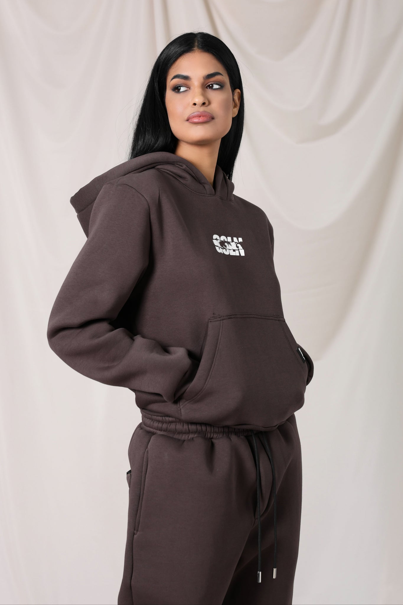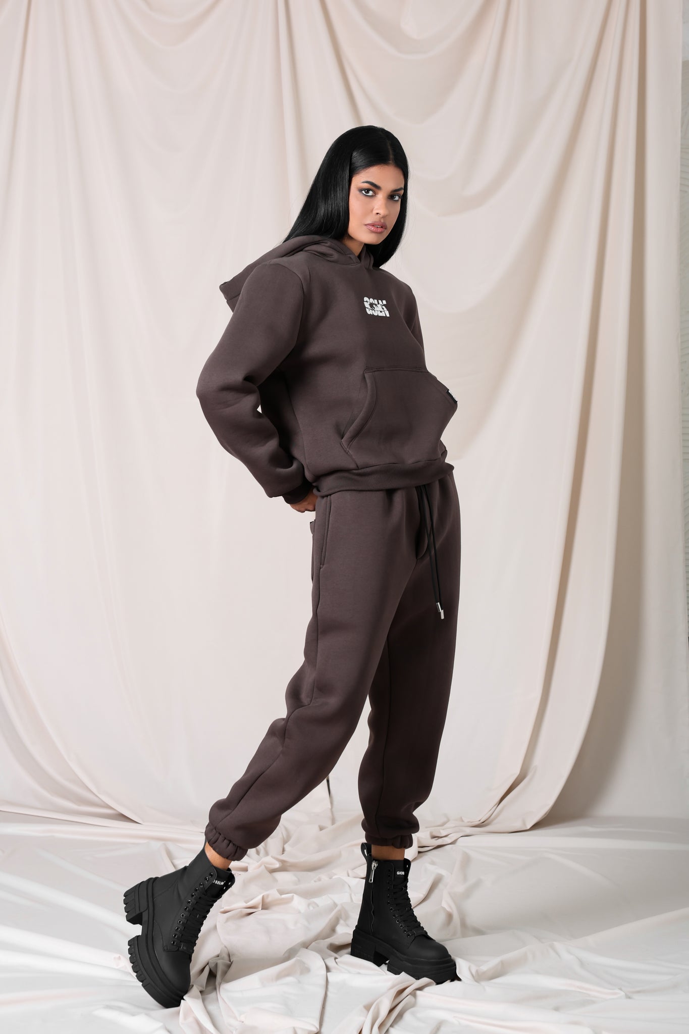 Un completo che esprime l’anima streetwear di Gioselin, mantenendo un tocco raffinato grazie alla nuance marrone. La modella indossa la taglia S.