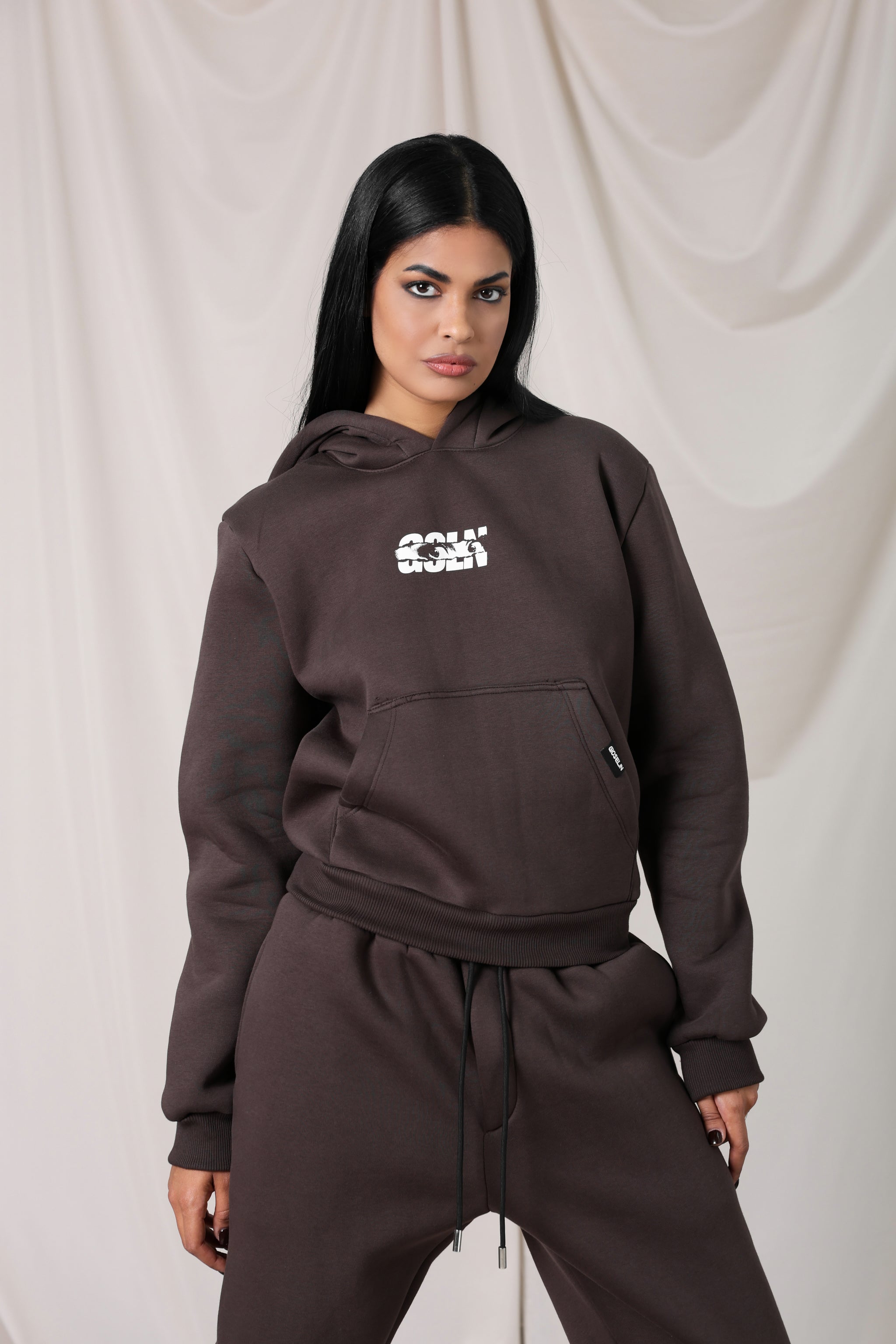 La felpa con cappuccio e ampio tascone frontale è impreziosita dal logo “Eyes”, segno distintivo e iconico della collezione. Il pantalone, dotato di coulisse regolabile in vita, garantisce una vestibilità comoda e dinamica, ideale per ogni occasione casual.