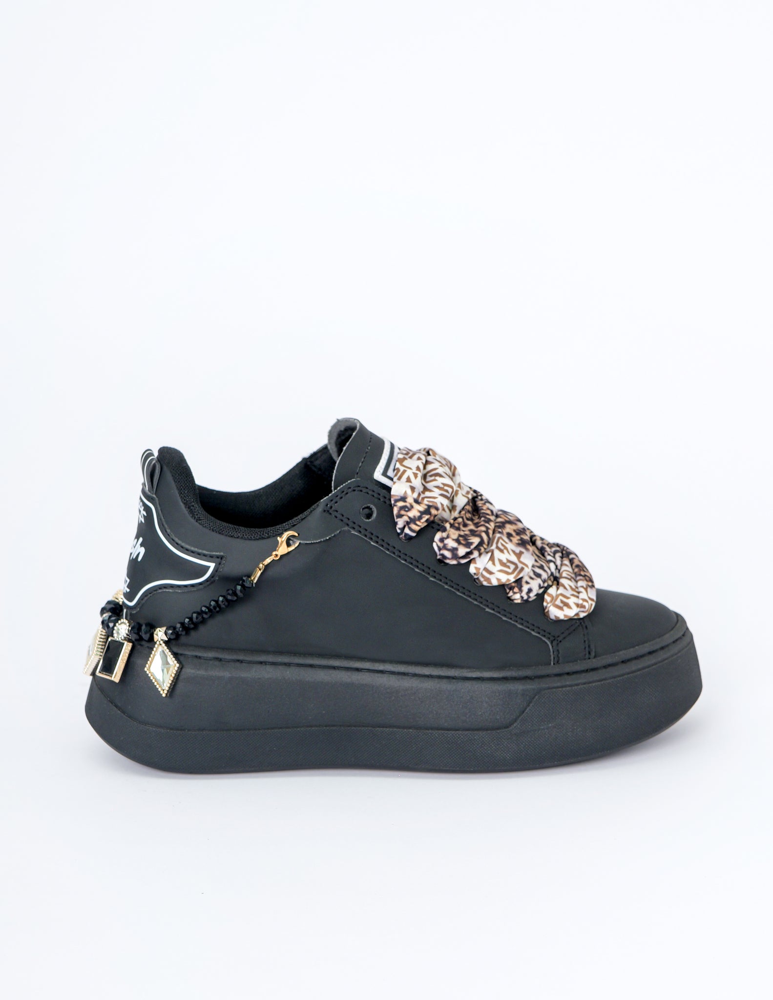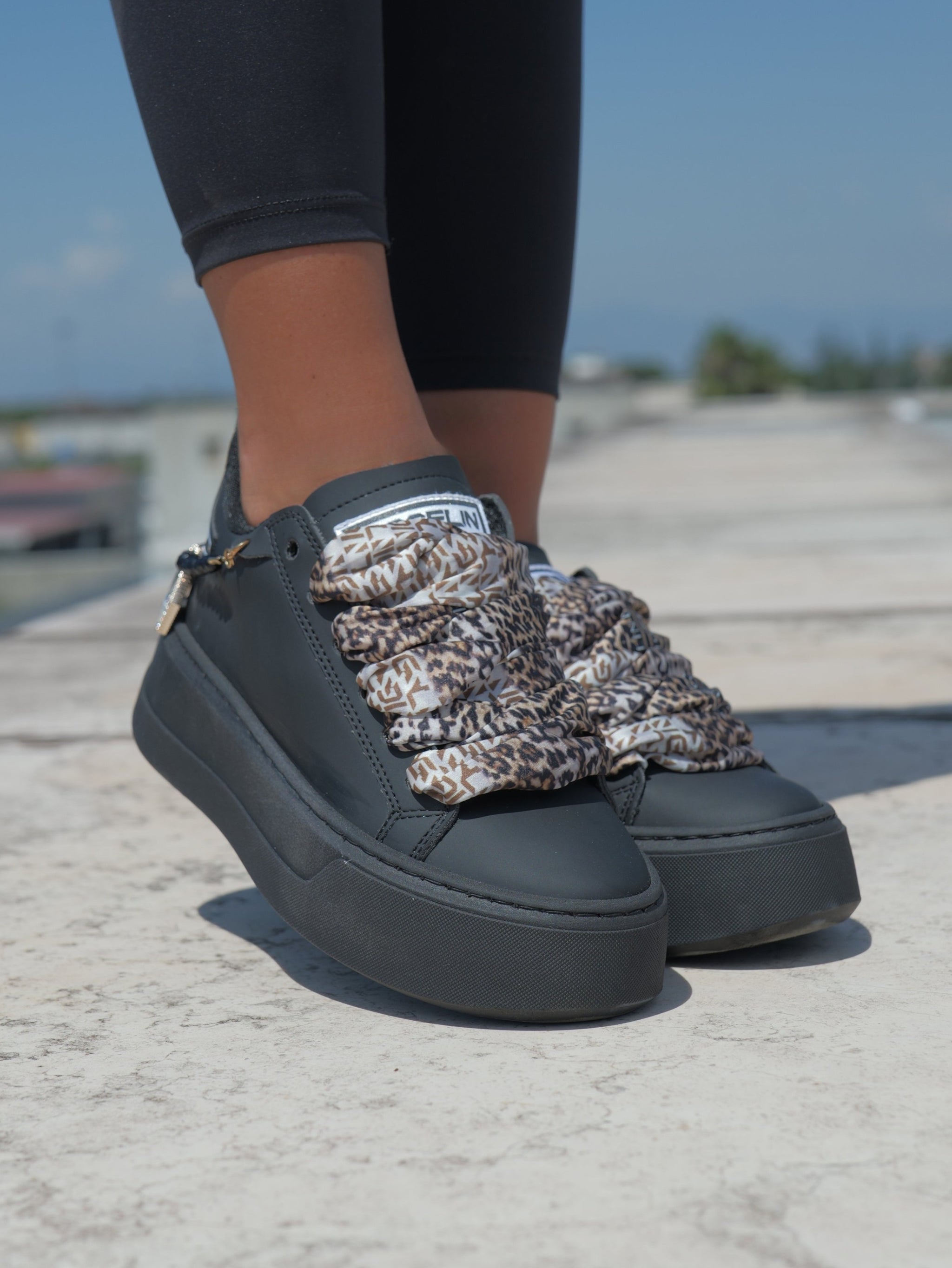 Total black, ma tutt’altro che ordinaria: questa sneaker Gioselin unisce la potenza del nero profondo alla luce degli accessori gioiello che adornano la caviglia con un tocco glamour e irresistibile. Il laccio foulard animalier spezza la monocromia con classe, donando una personalità decisa e contemporanea a ogni look.