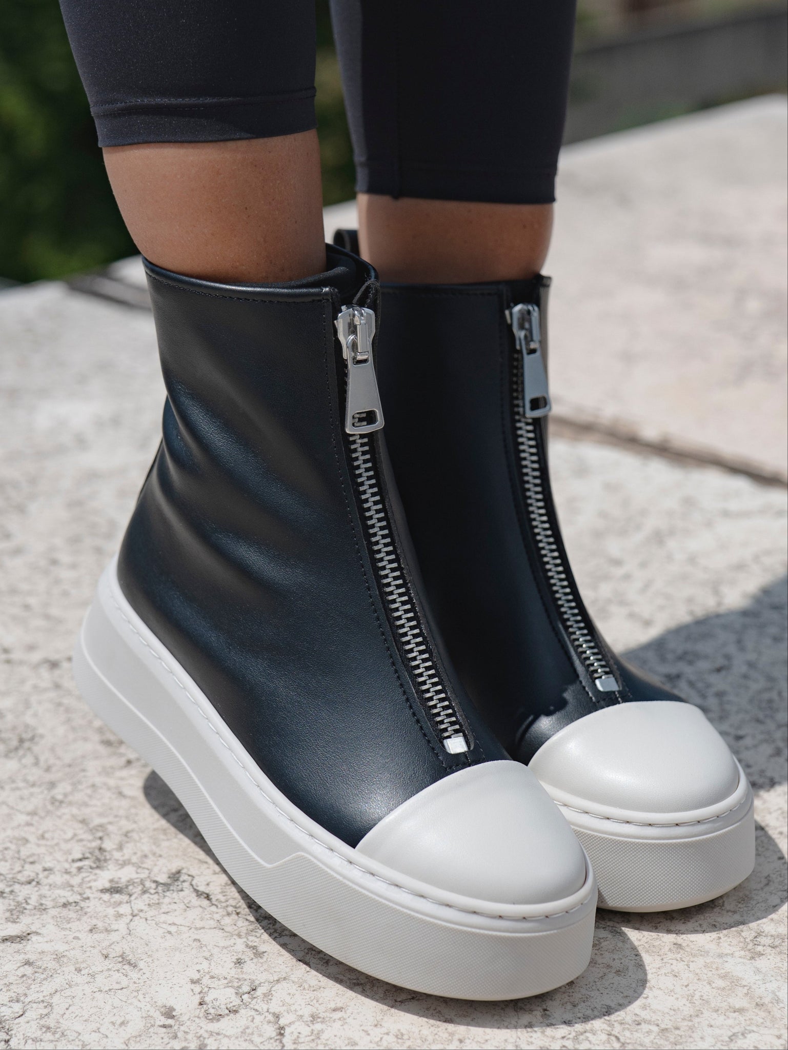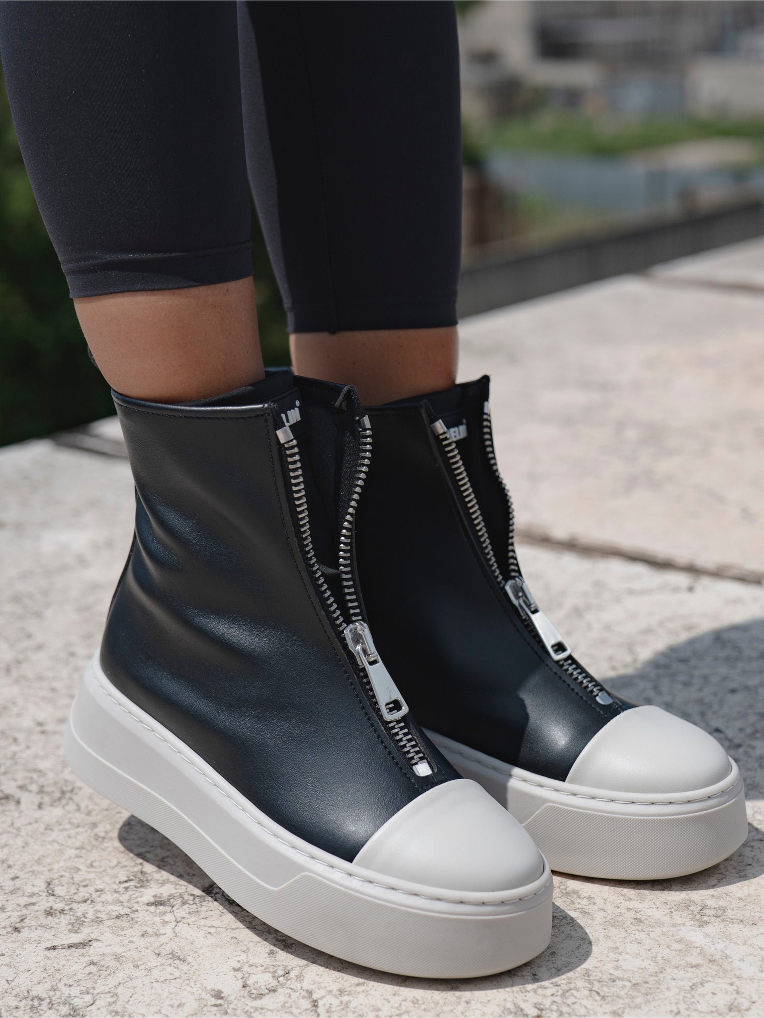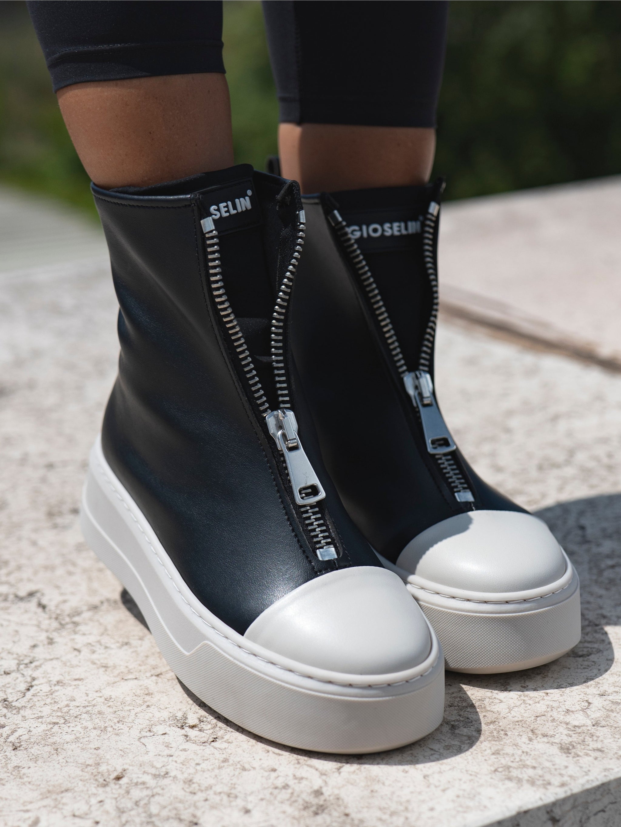 La tomaia nera dal taglio essenziale si arricchisce di una doppia zip frontale completamente apribile, che consente di trasformare la scarpa in base al proprio stile e alle esigenze del momento. La punta tondeggiante in contrasto aggiunge un accento contemporaneo, mentre la suola platform (5,5 cm sul tallone e 4 cm sull’avampiede) regala altezza e comfort in ogni passo. Il gambale alto 14 cm abbraccia la caviglia con stabilità e stile.