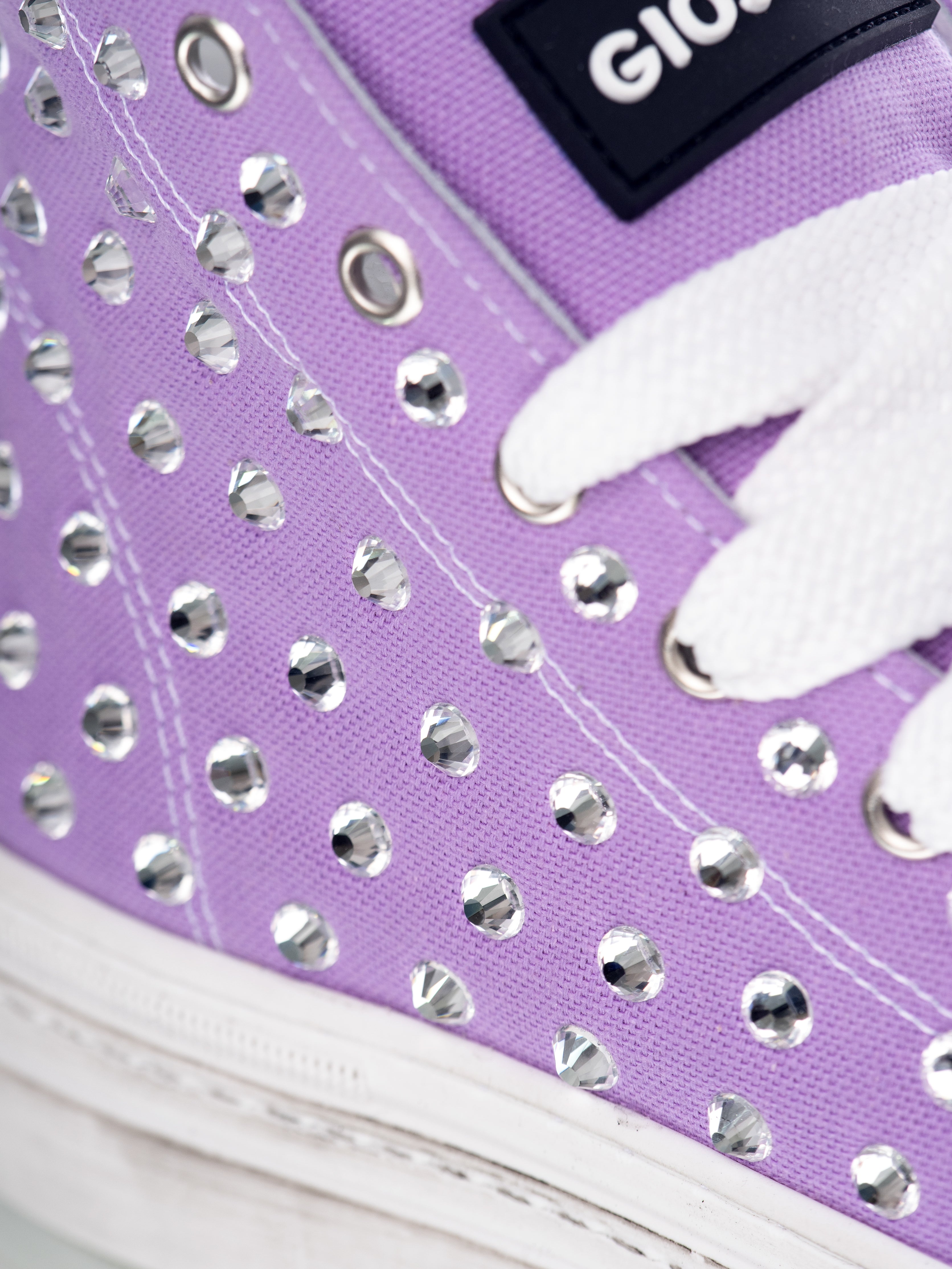 ✔ Fliederfarbenes Obermaterial mit glänzenden Kristallen – für einen exklusiven Look