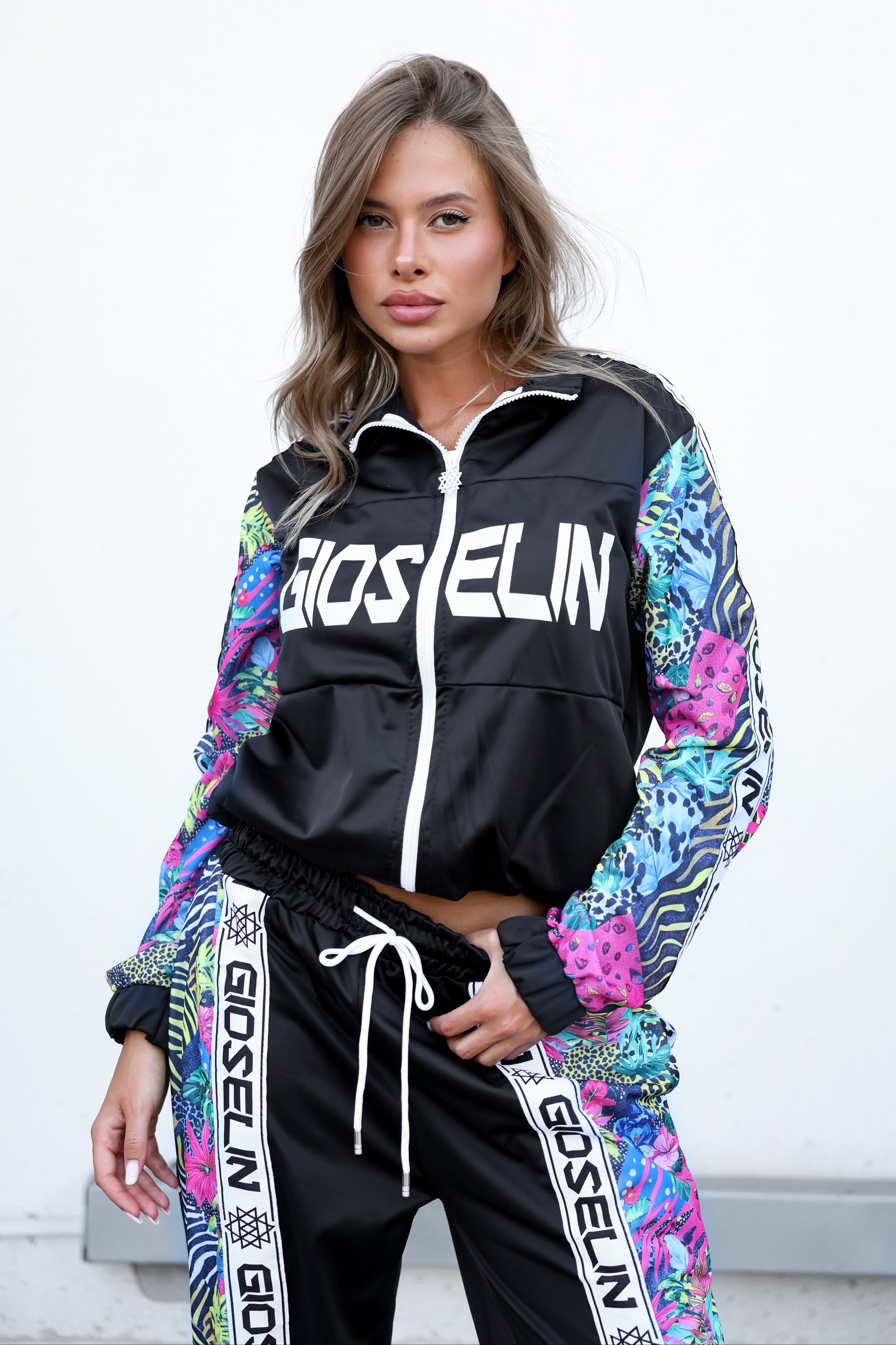 Il completo – venduto insieme – è composto da giacca zip cropped e pantaloni regolabili con coulisse, entrambi impreziositi dal logo Gioselin a banda laterale, vero tratto distintivo del brand. Ma ciò che rende unica Jungle è il suo design: pattern jungle multicolor che abbracciano maniche e fasce laterali, con accenti fluo e animalier che catturano lo sguardo e riflettono tutta la potenza della tua energia interiore.