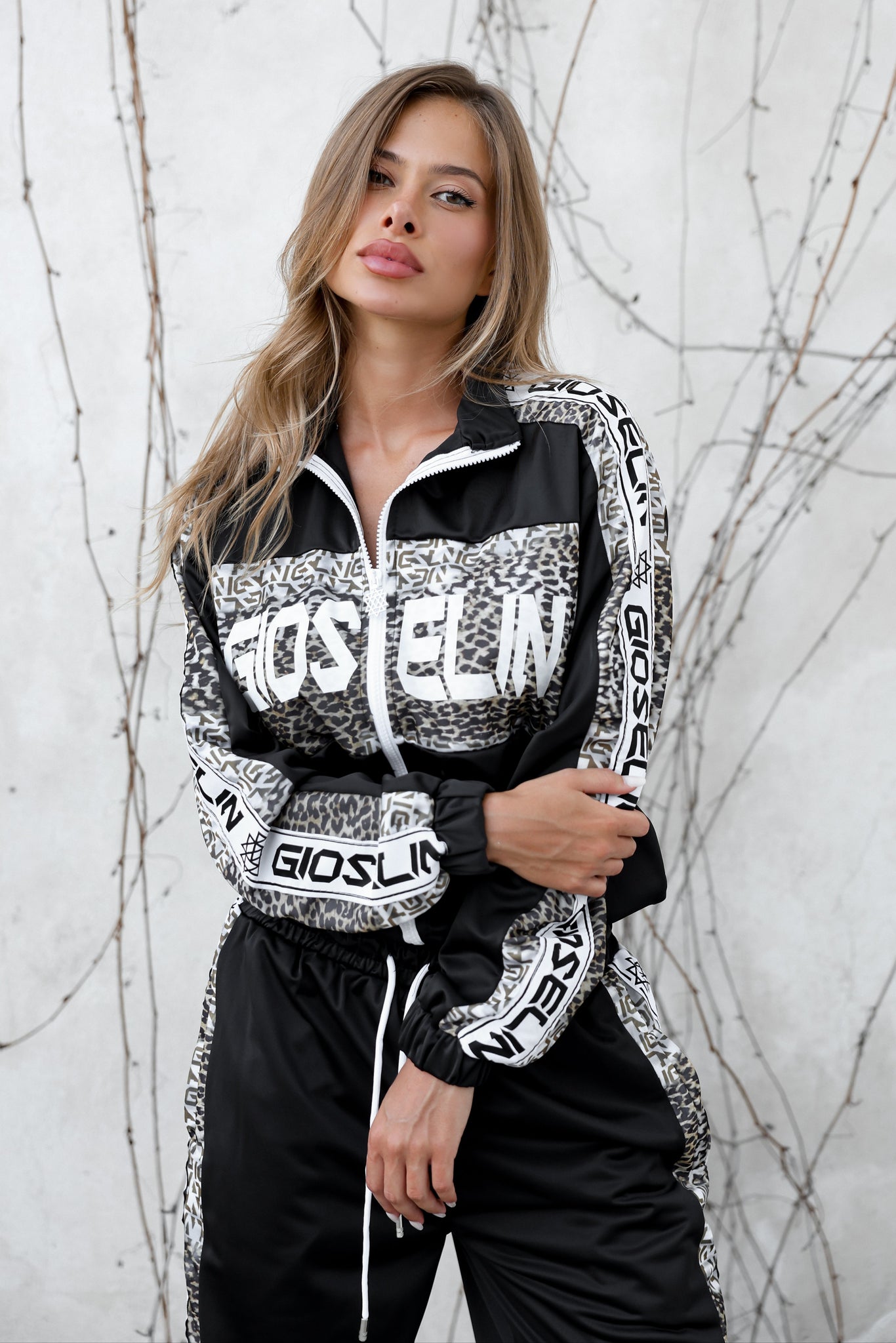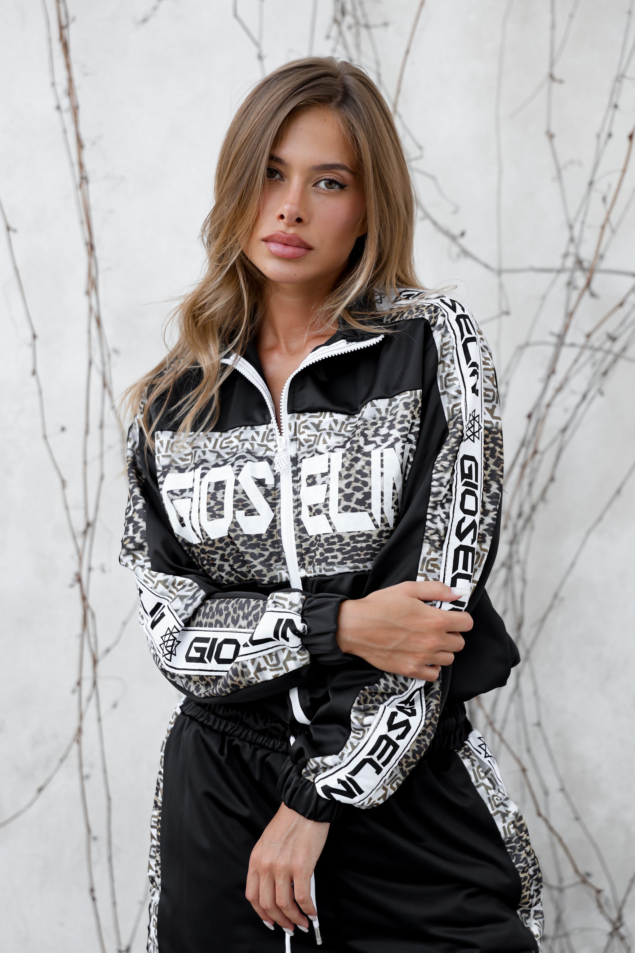 Realizzata in acetato tecnico lucido, questa tuta – venduta completa – si compone di una giacca con zip centrale e pantaloni con coulisse regolabile, pensati per valorizzare la figura senza rinunciare al comfort. La stampa leopardata si intreccia con le bande logate GIOSELIN in una composizione dinamica e super fashion, che conquista al primo sguardo.