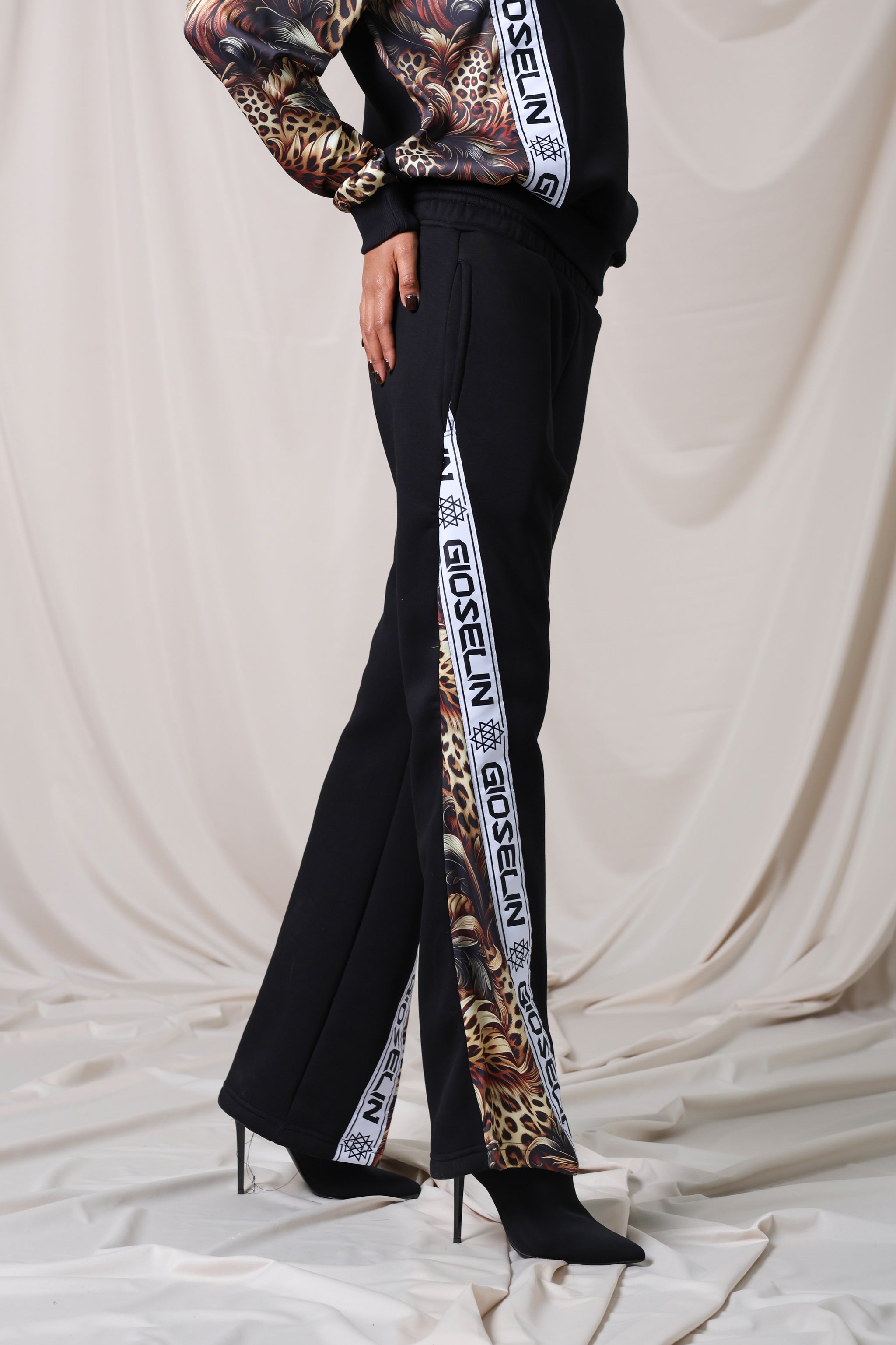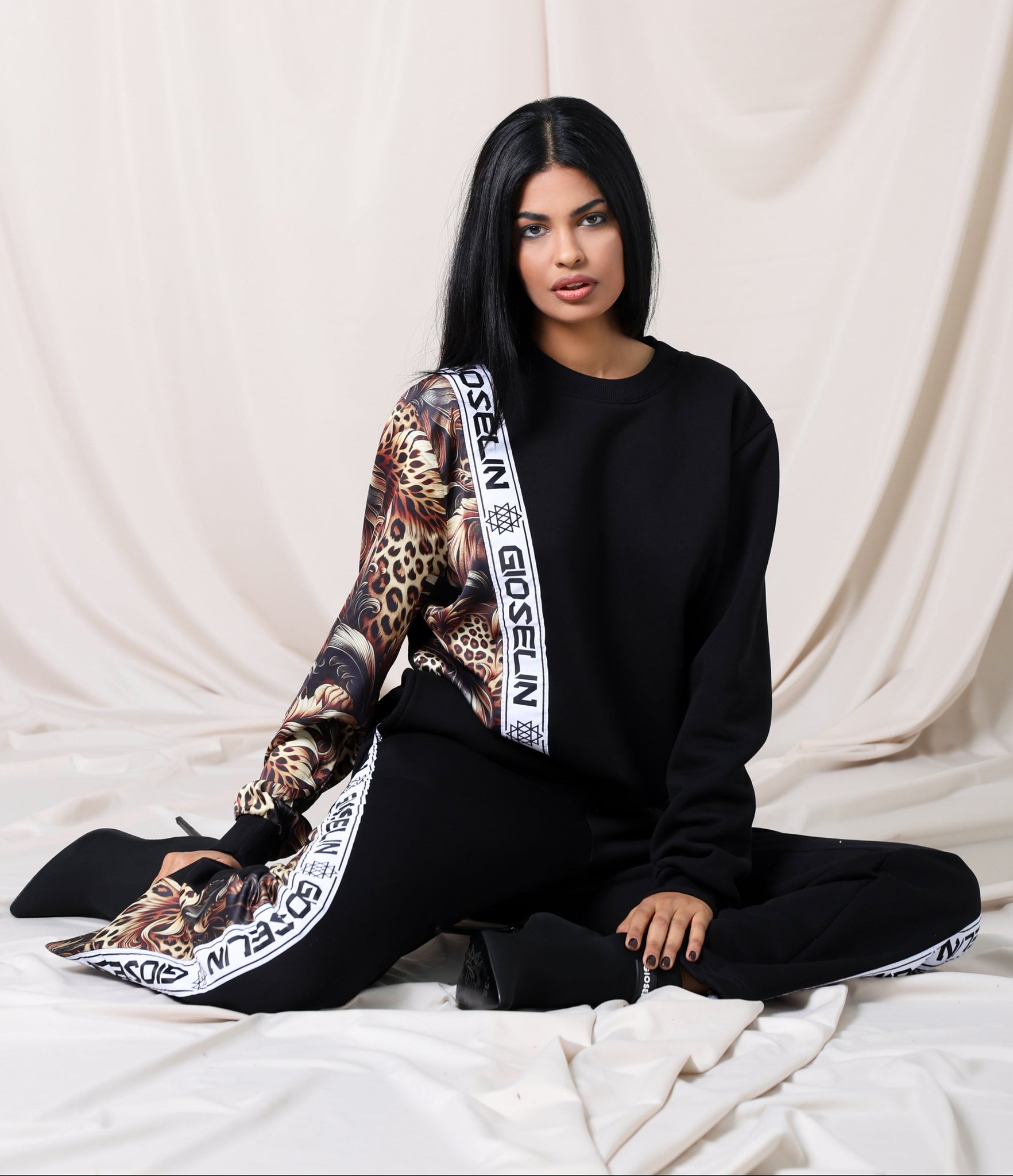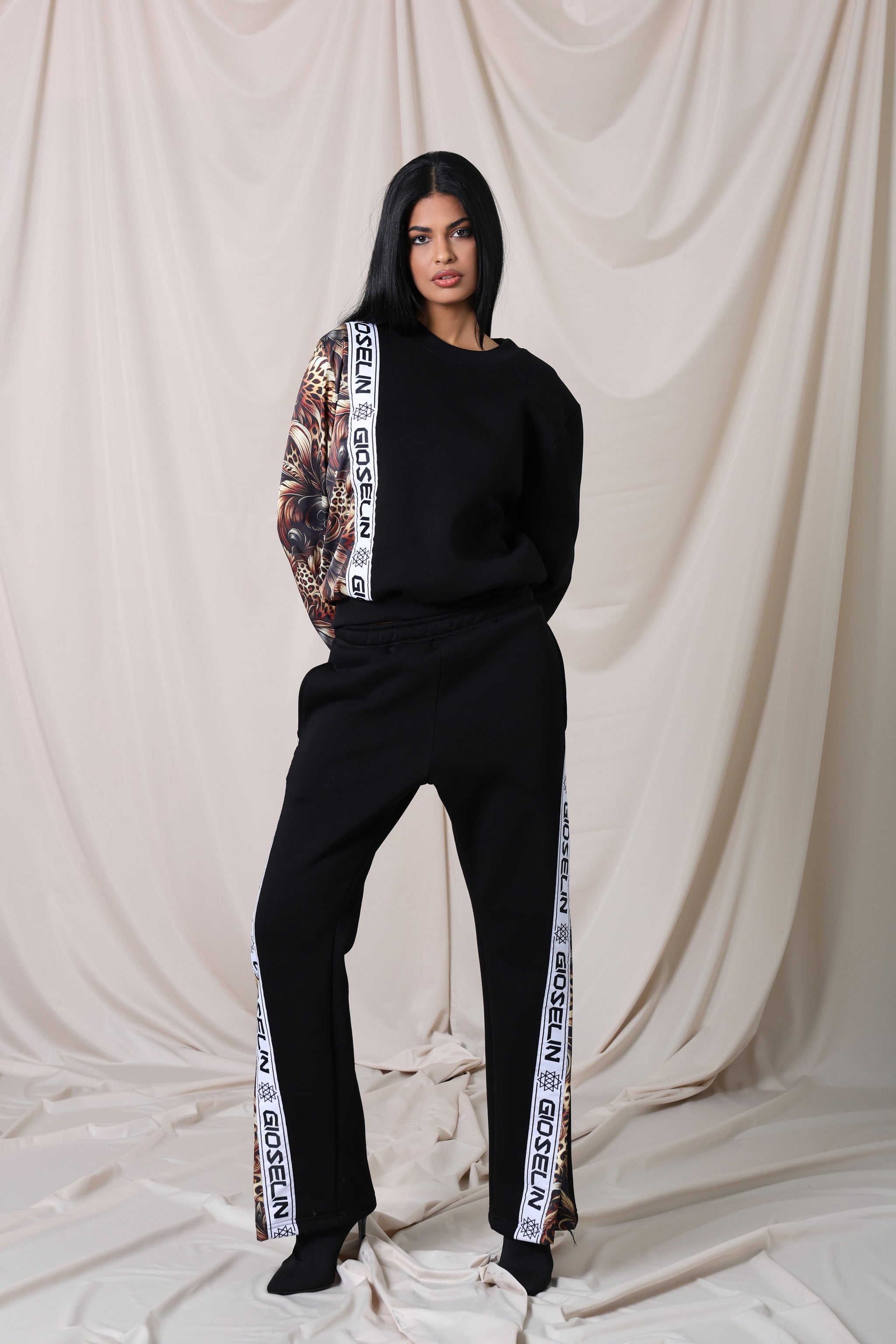 La felpa è arricchita da elastico sul fondo e inserti in raso a tema barocco/wild, che aggiungono un tocco di luce e raffinatezza al total black. Il pantalone, con elastico in vita, presenta un elegante taglio a zampa che valorizza la figura mantenendo la comodità tipica dello stile urban.