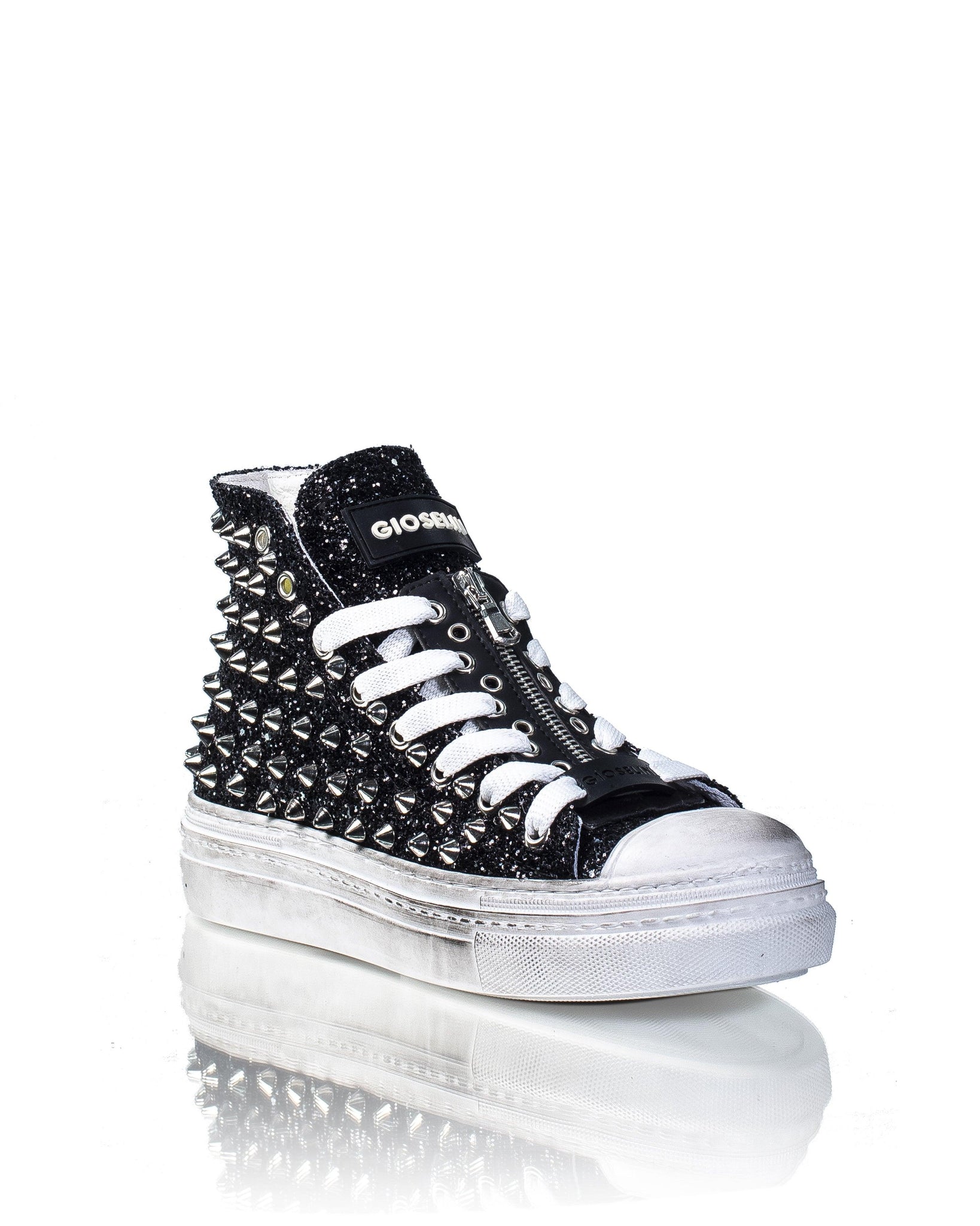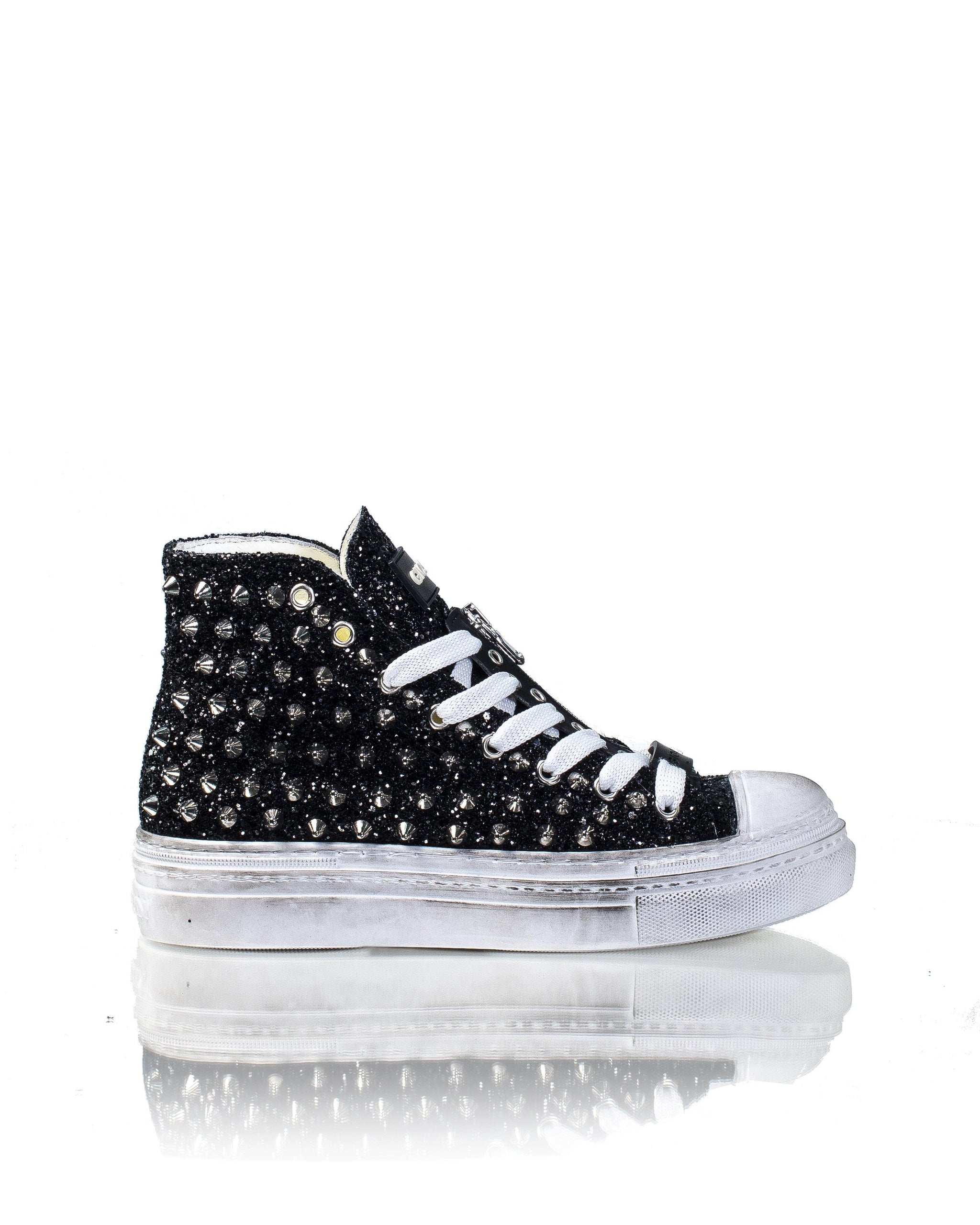 Die schwarzen Glitzer-Sneaker passen perfekt zu allen, den schönsten. Der Glitzereffekt lässt Sie bei jedem Anlass glänzen und verleiht Ihrem Look einen Hauch von Eleganz und Originalität. Die dicke, konturierte Sohle mit einer Höhe von 5 cm sorgt für Komfort und Stil bei jedem Schritt.