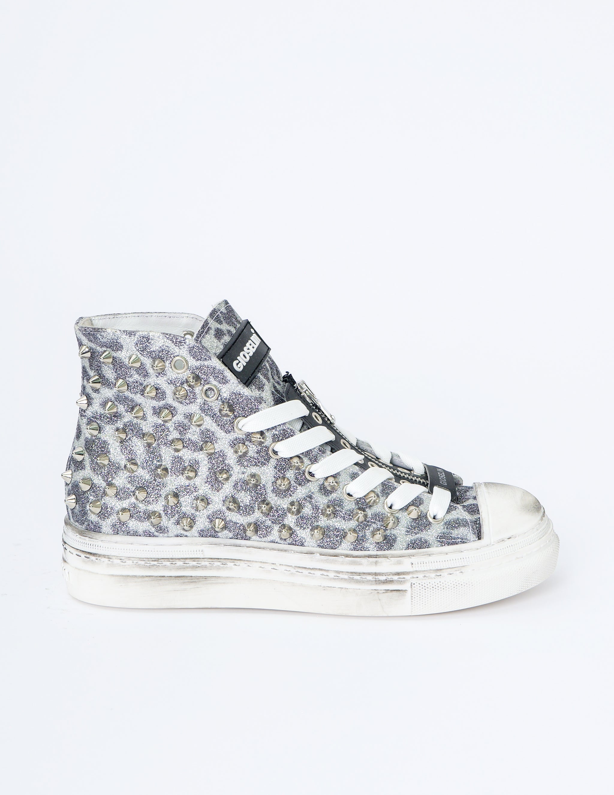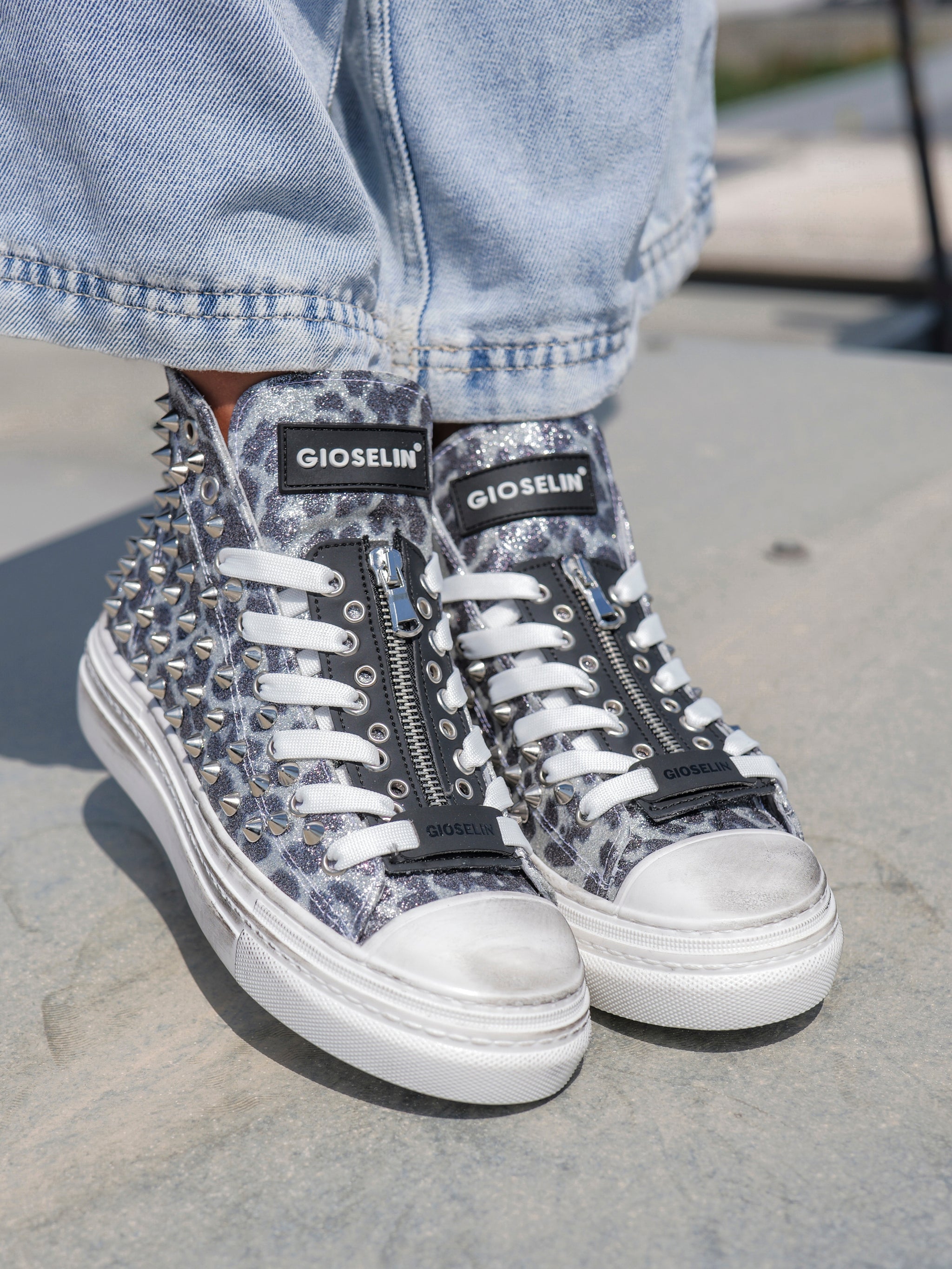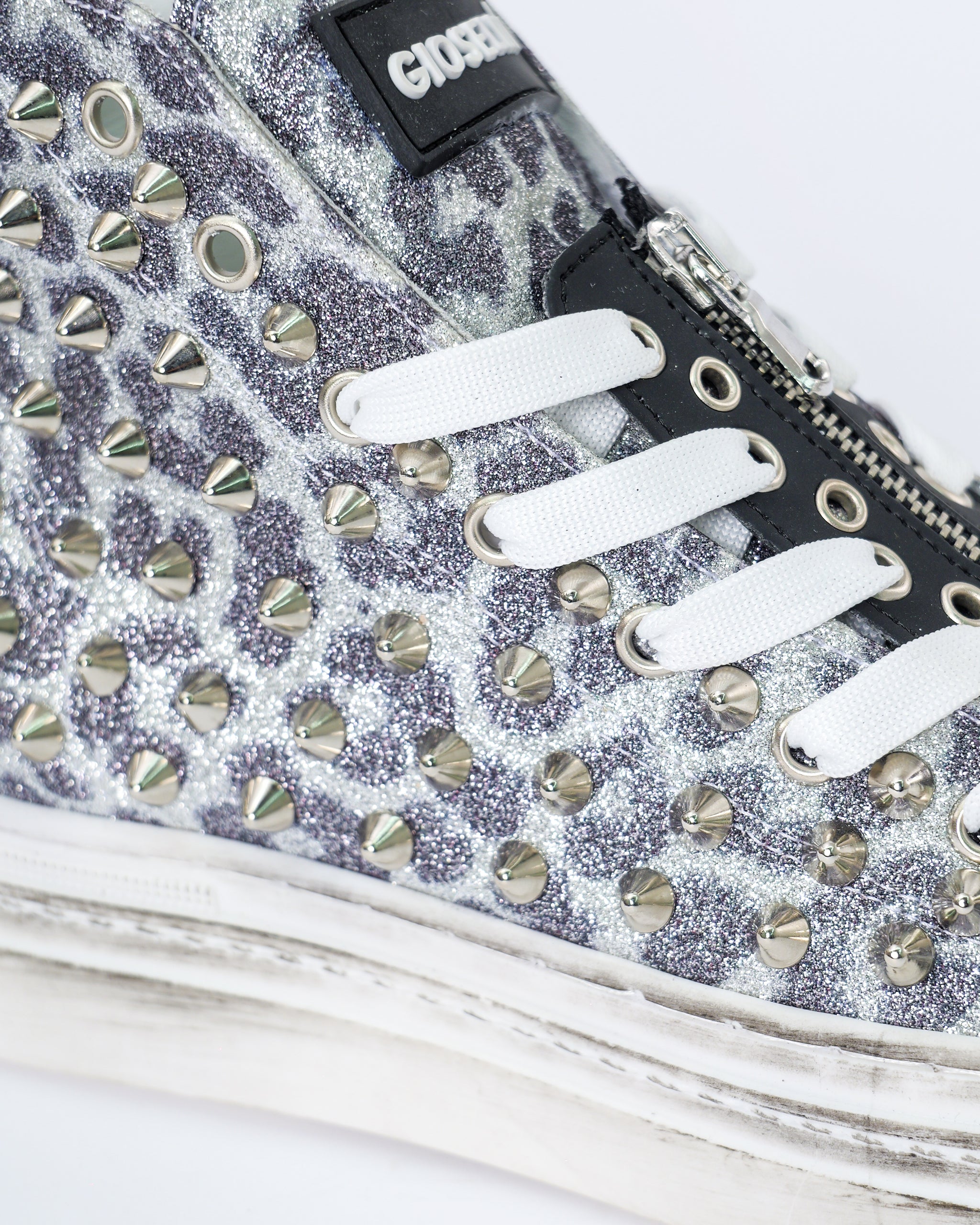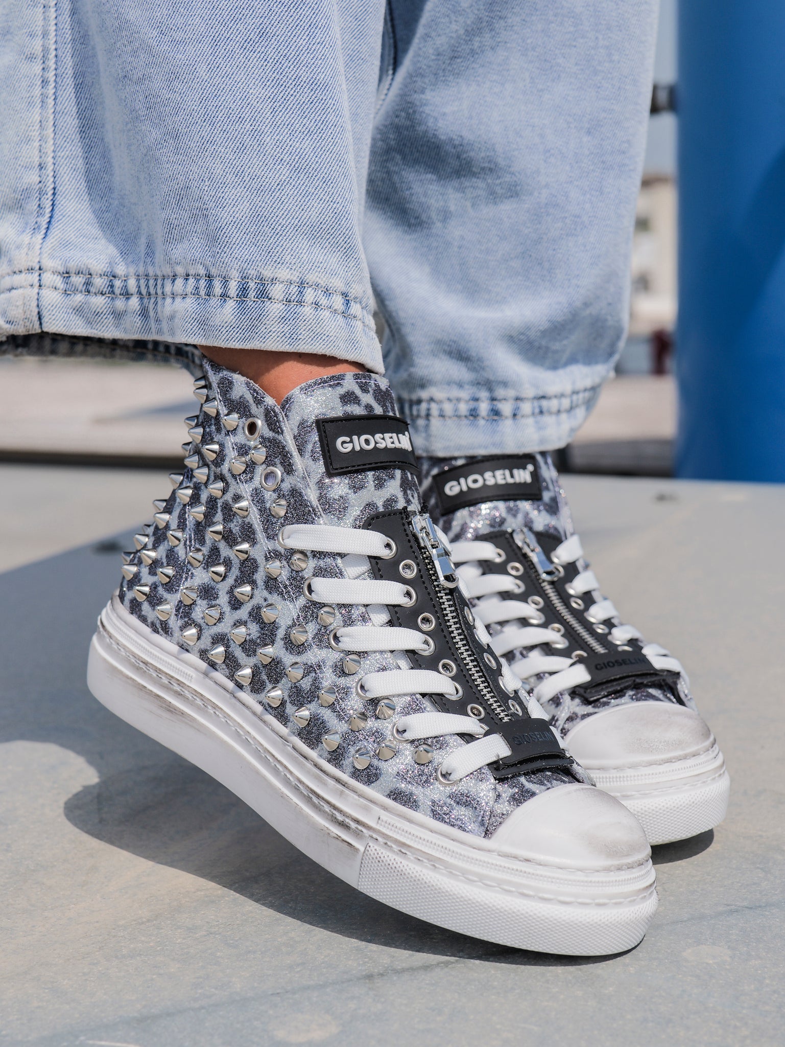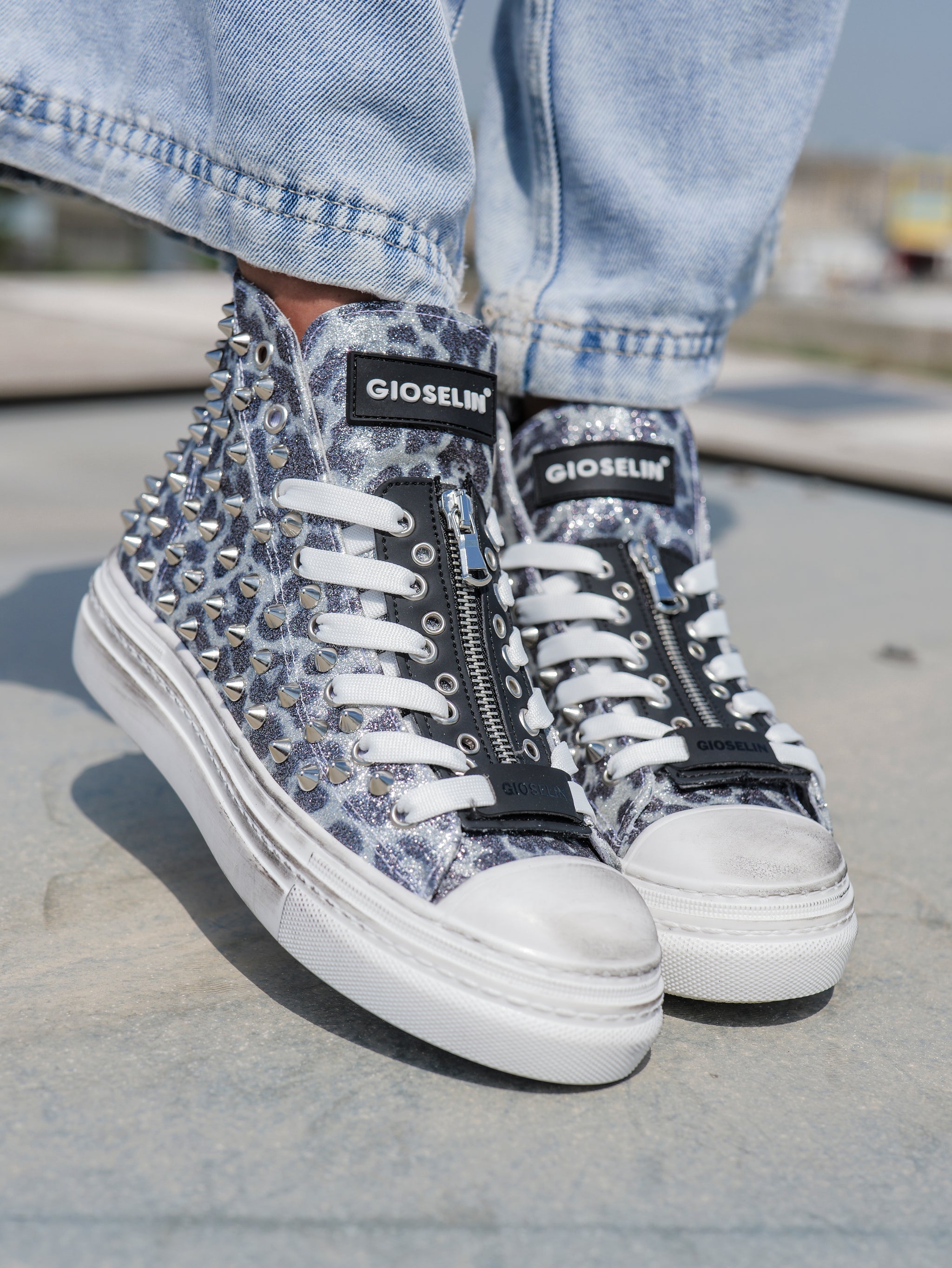 Lasciati conquistare dal fascino indomabile di Play Silver Wild, la sneaker high-top Gioselin che unisce grinta, glamour e originalità in un unico modello iconico. Una reinterpretazione audace del best seller Gioselin, ora proposta in versione animalier glitterato argento con borchie in metallo nickel, per uno stile che ruggisce e brilla allo stesso tempo.