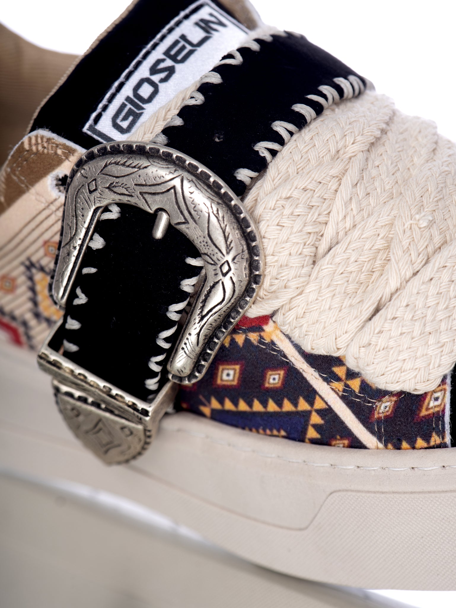 Mit einem inhärenten Charme, der die Seele des Wilden Westens einfängt, verkörpern die Schuhe von Spirit of Texas das Abenteuer und den freien Geist dieser ethnischen Zugehörigkeit. Das Herzstück dieser Schuhe ist die Schnalle im Ethno-Stil, ein charakteristisches Element, das an die Traditionen und Künste der Ureinwohner erinnert. Jede Schnalle ist ein einzigartiges Kunstwerk, fein handgenäht mit aufwendigen Details und lebendigen Farbtönen, die Geschichten über alte Wege und unbezwingbare Legenden erzählen.