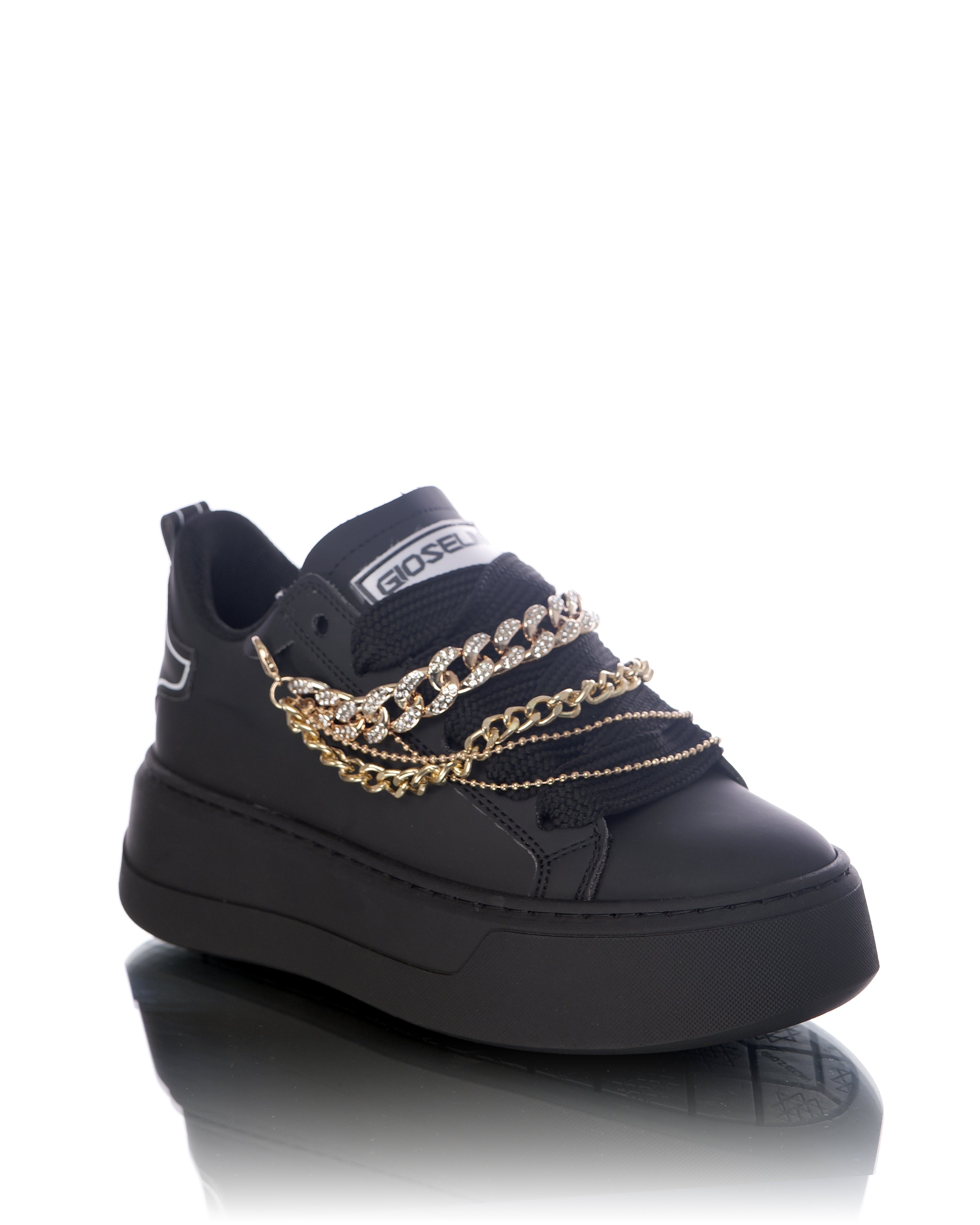 Das Modell Collier von Gioselin ist eine echte Stil-Erklärung: Eleganz trifft auf Moderne in einem Sneaker mit exklusivem und unverwechselbarem Design. Die schlichte, weiße Basis dieses Schuhs bietet die perfekte Bühne für das auffälligste Detail – eine abnehmbare Schmuckkette, inspiriert von der zeitlosen Schönheit klassischer Collier-Halsketten. Sorgfältig gefertigt, kombiniert die Kette goldfarbene Glieder mit funkelnden Kristallen, die sich kunstvoll über das Obermaterial legen – ein raffiniertes Spiel aus Licht und Bewegung, das den Sneaker in ein tragbares Schmuckstück verwandelt.
