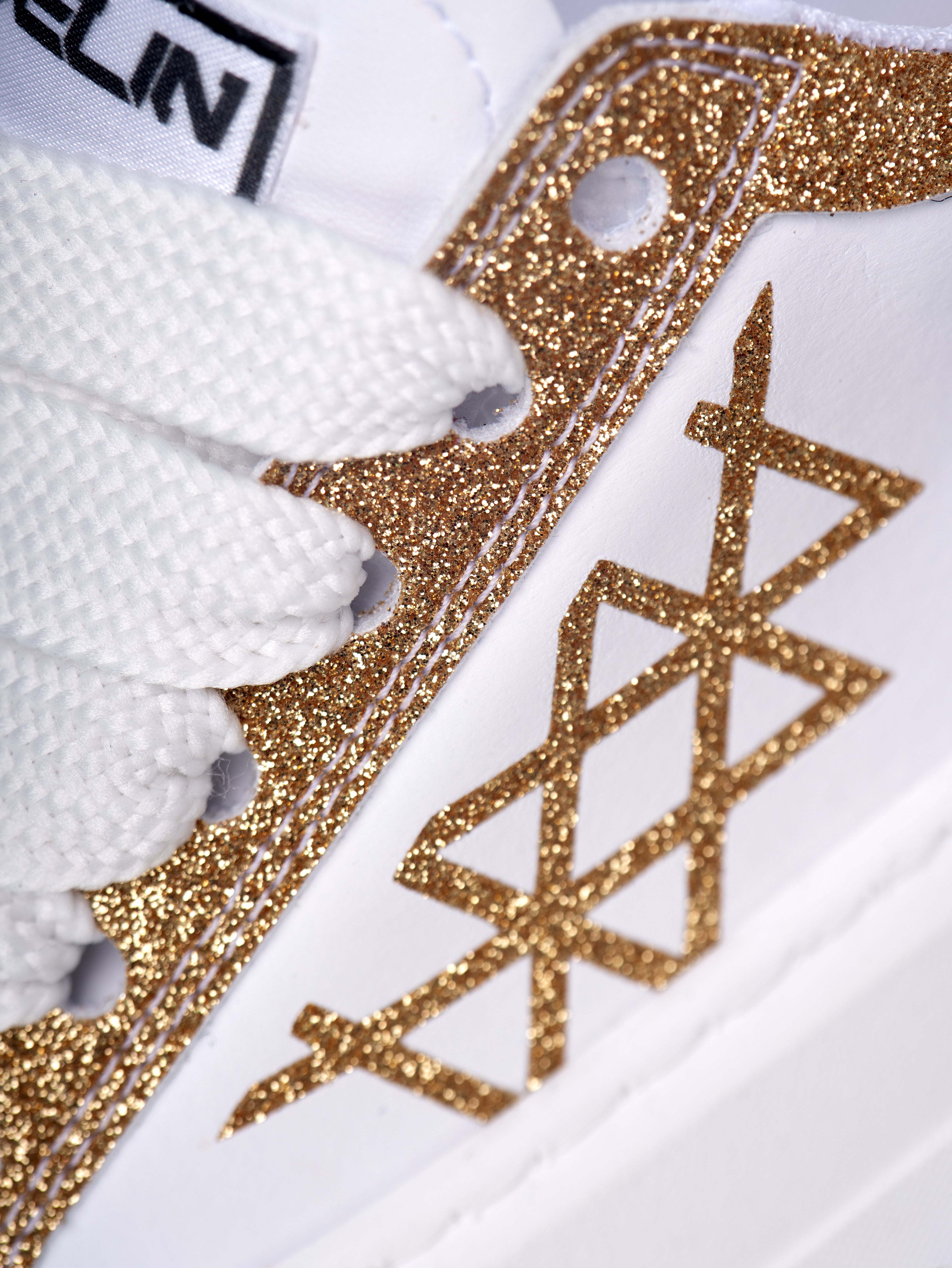 Und wir dürfen die funkelnden Details nicht vergessen, die Bridge einen Hauch von Magie verleihen. Mit zarten Glitzerdetails erstrahlt dieser Schuh in einer aufmerksamkeitsstarken Leuchtkraft, die Ihre mutige, einzigartige Persönlichkeit widerspiegelt. Gioselins unverwechselbares Logo, ein Symbol für kompromisslose Qualität und Stil, wird in ein glitzerndes Kunstwerk verwandelt und fachmännisch in den Schuh eingearbeitet.