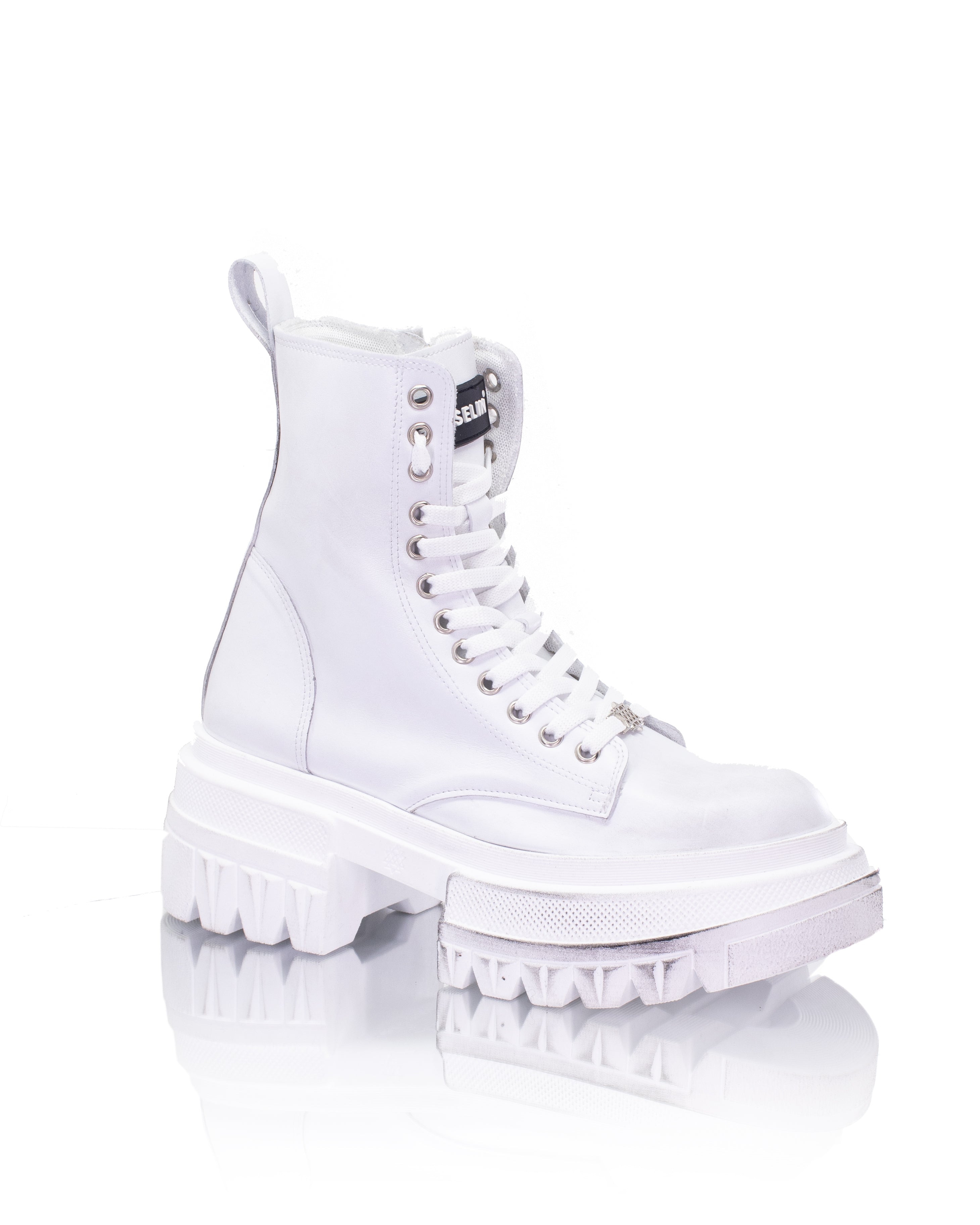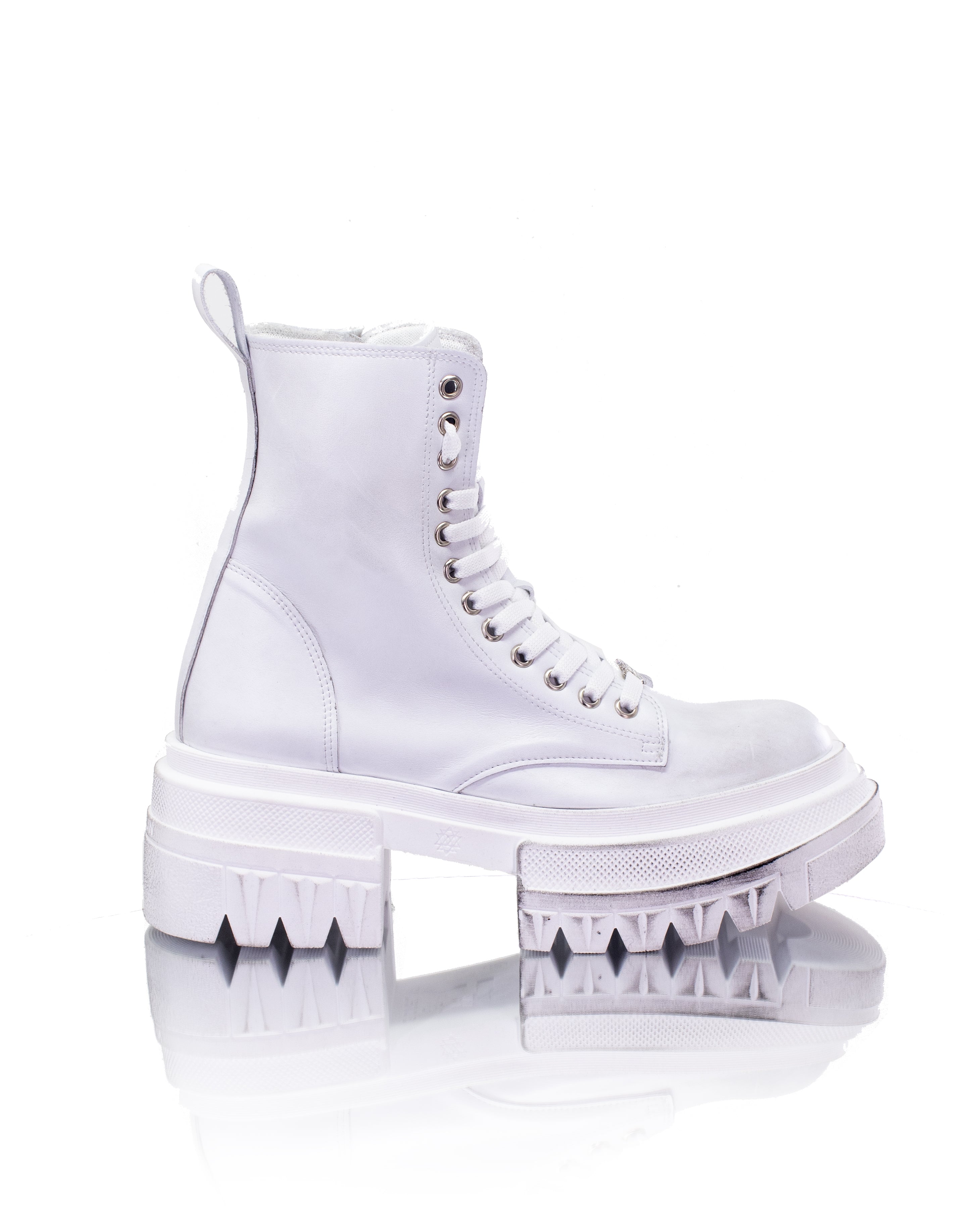 Mit einem nach oben verlängerten Modell sind diese weißen Kampfstiefel perfekt für alle, die einen Hauch von Rebellion und ein Bild von Selbstvertrauen suchen.