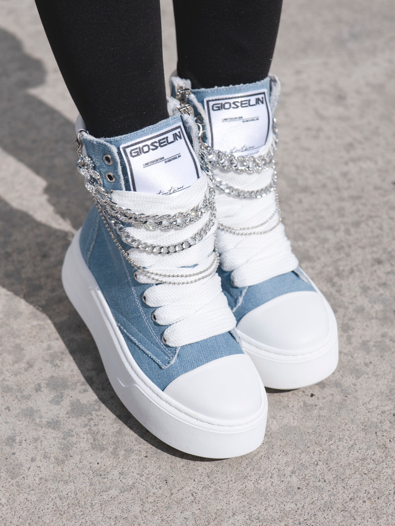 Gefertigt aus hochwertigem Denim – dem Material schlechthin für Freiheit und Individualität – wird der Stiefel durch das abnehmbare Collier-Accessoire veredelt: eine goldene Kette mit funkelnden Kristallen, die den Schaft umspielt und dem Schuh einen luxuriösen Gioselin-Touch verleiht. Ein Detail, das Streetwear in ein echtes Fashion-Statement verwandelt.
