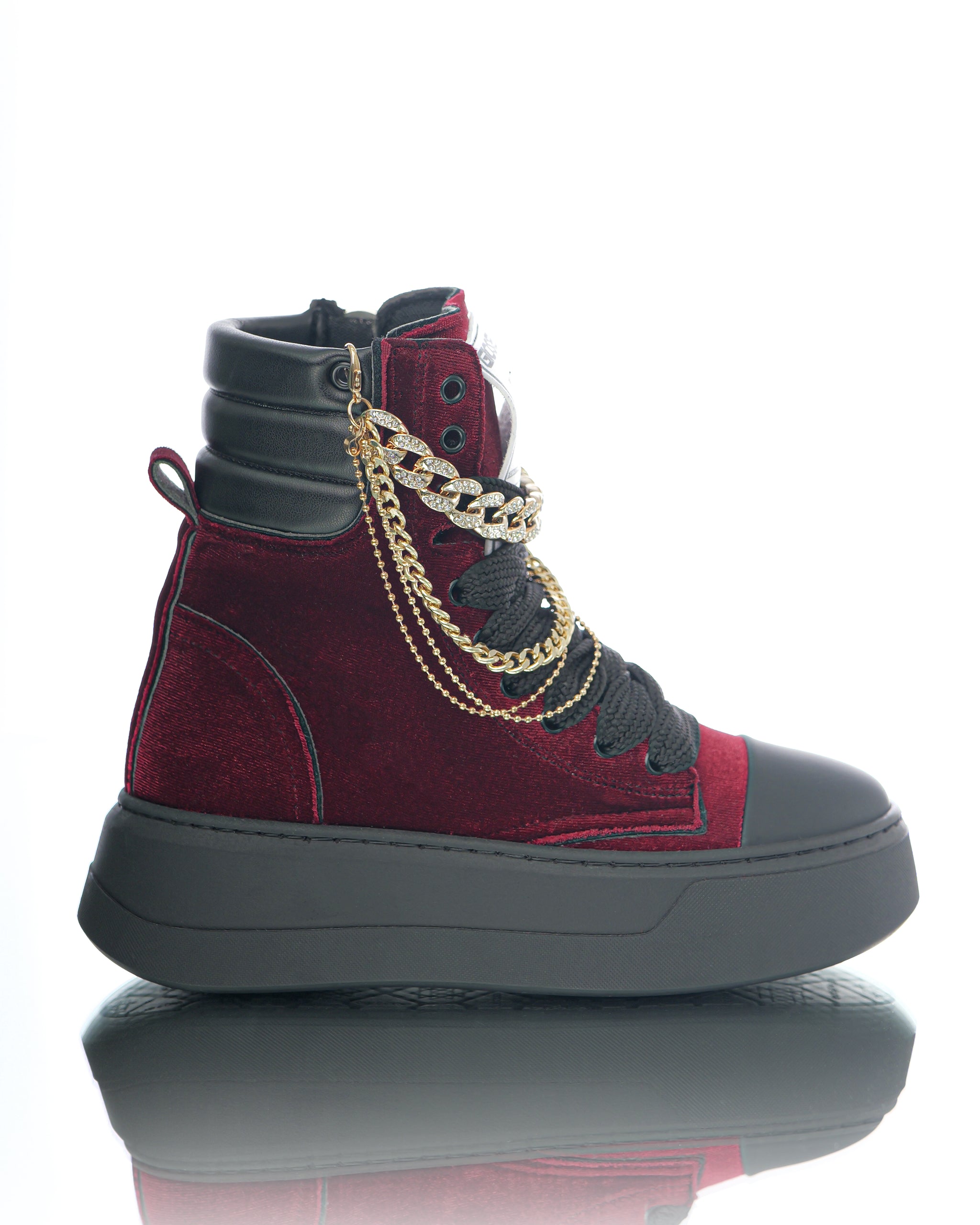 La catena dorata, arricchita da cristalli scintillanti, avvolge il gambale in velluto con una raffinatezza senza tempo, trasformando lo stivale in un vero gioiello da indossare. Il design solido e strutturato dello stivale, unito alla versatilità dell’accessorio removibile, lo rende ideale per ogni occasione: da look casual-chic a outfit più eleganti e audaci.