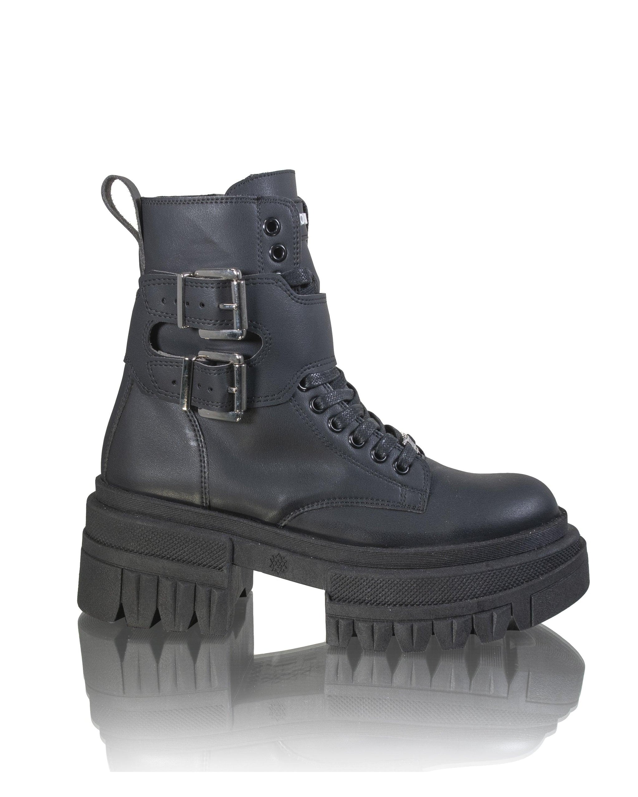 Das abnehmbare Nietenband ist ein einzigartiges Detail, das dem Design Charakter und Persönlichkeit verleiht. Mit dieser Funktion können Sie Ihren Look nach Ihren Wünschen anpassen und so zwischen einem rebellischeren und einem eleganteren Stil wechseln. Das Schnürmodell bietet eine große Auswahl an Passformoptionen, während die Laschen zum einfachen An- und Ausziehen sie praktisch und bequem machen. Die runde Spitze sorgt für zusätzliche Strapazierfähigkeit, während die dicke Sohle außergewöhnlichen Halt bietet.