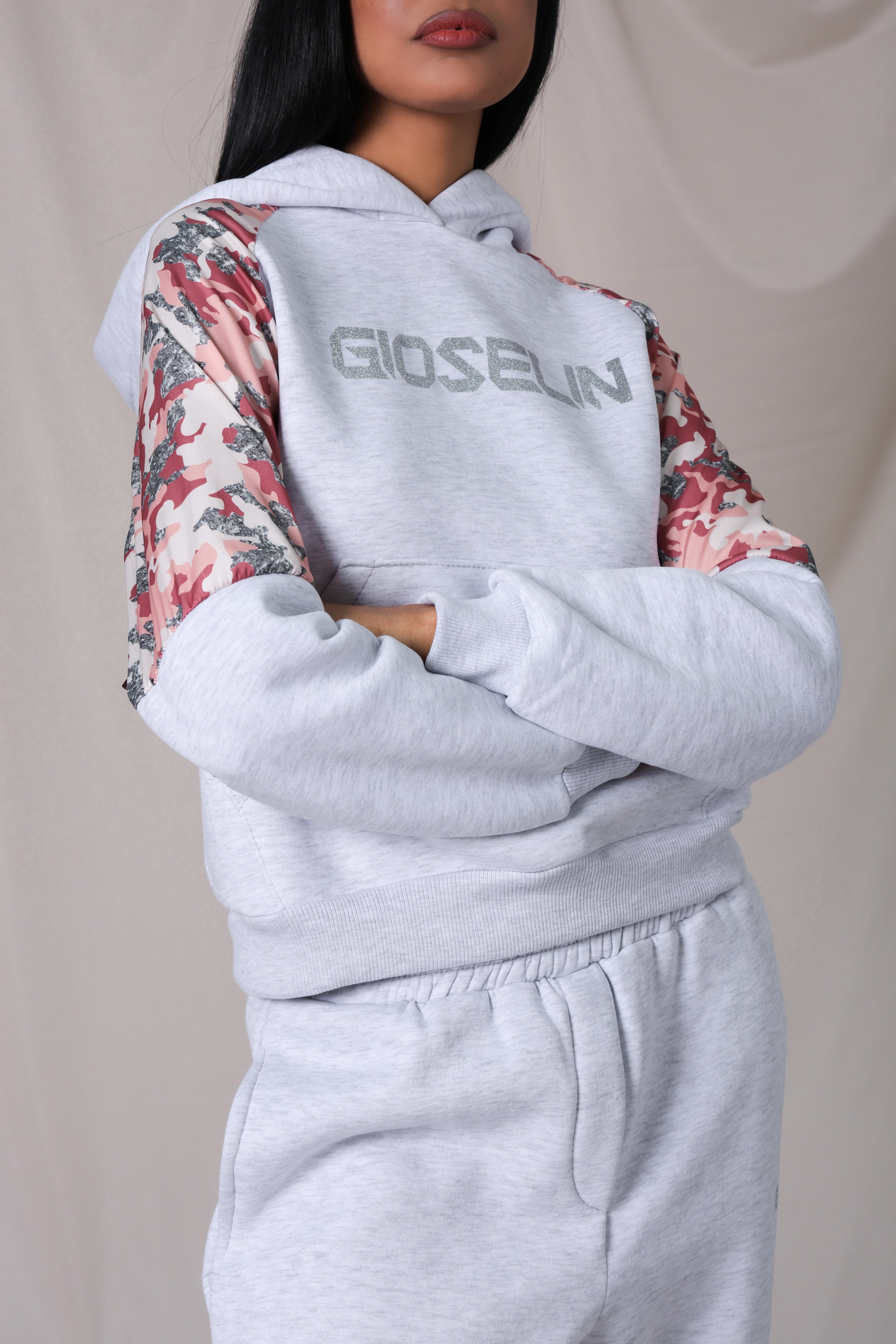 La felpa è dotata di cappuccio e fascia elastica in vita per una vestibilità confortevole, arricchita dal logo Gioselin glitterato e dalle maniche con dettagli camouflage shine, che donano un tocco glamour e contemporaneo. Il pantalone, con elastico in vita, completa il look con praticità e stile.