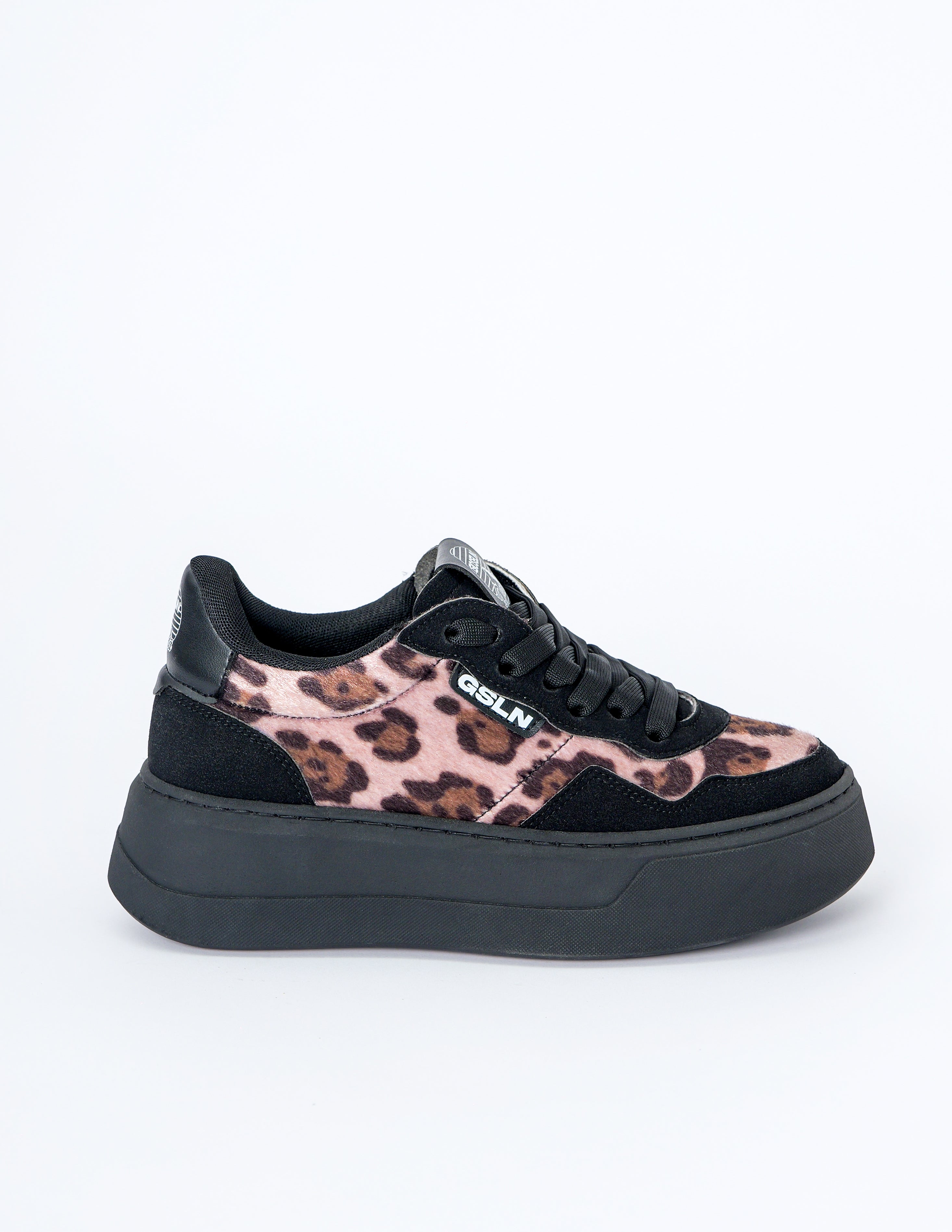 La tomaia effetto pelliccia è decorata da un pattern maculato in tonalità calde e terrose, perfettamente bilanciato dal nero profondo dei dettagli e dalla suola platform total black, che slancia la figura senza rinunciare al comfort. La texture ricca e materica dona movimento e personalità, rendendo ogni passo una dichiarazione di identità.
