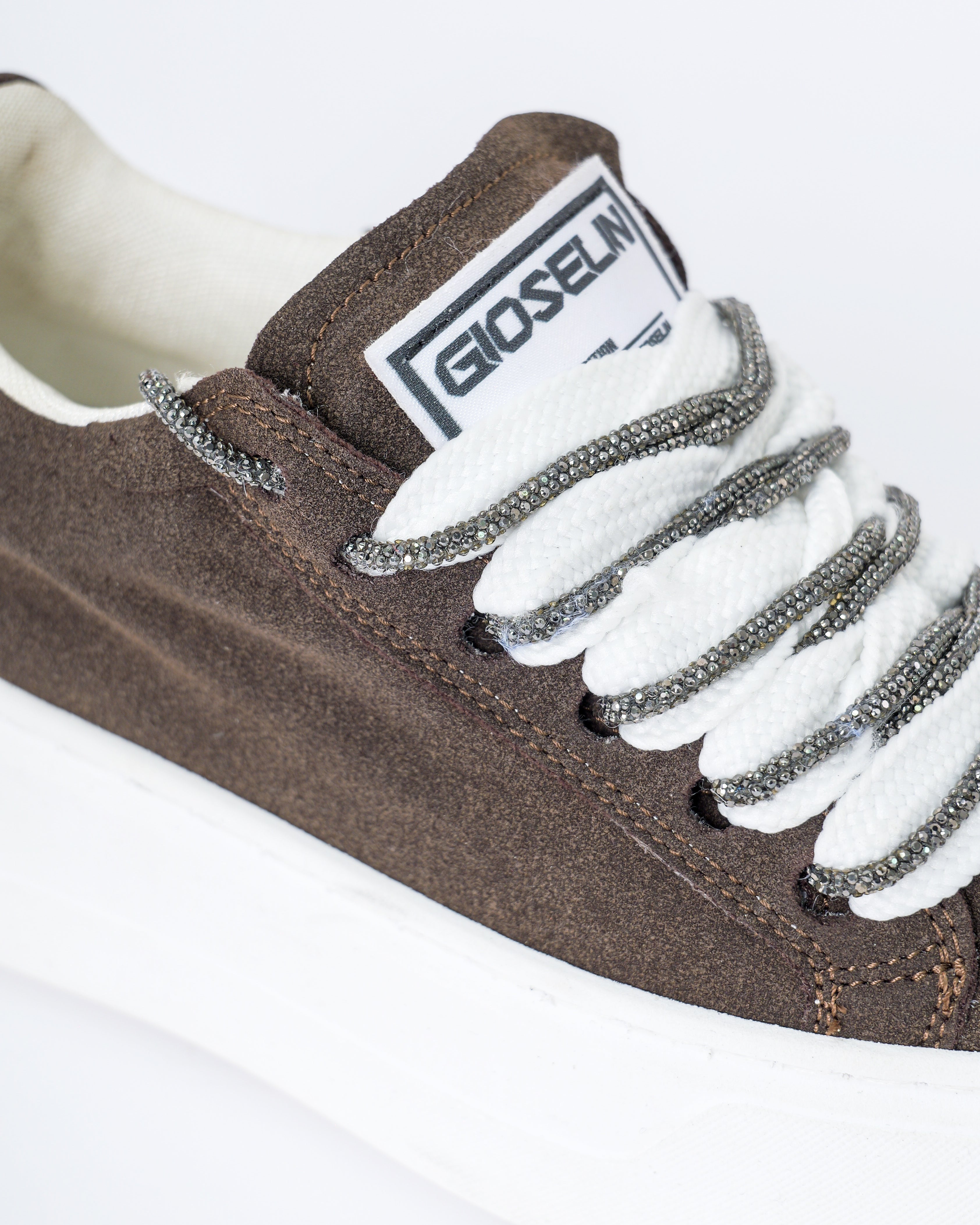 Realizzata in crostina marrone di altissima qualità, la scarpa è impreziosita dal laccio “Diamond” con dettagli in strass che aggiunge una luce raffinata e un tocco glamour, perfetto per completare look sia casual che più chic.