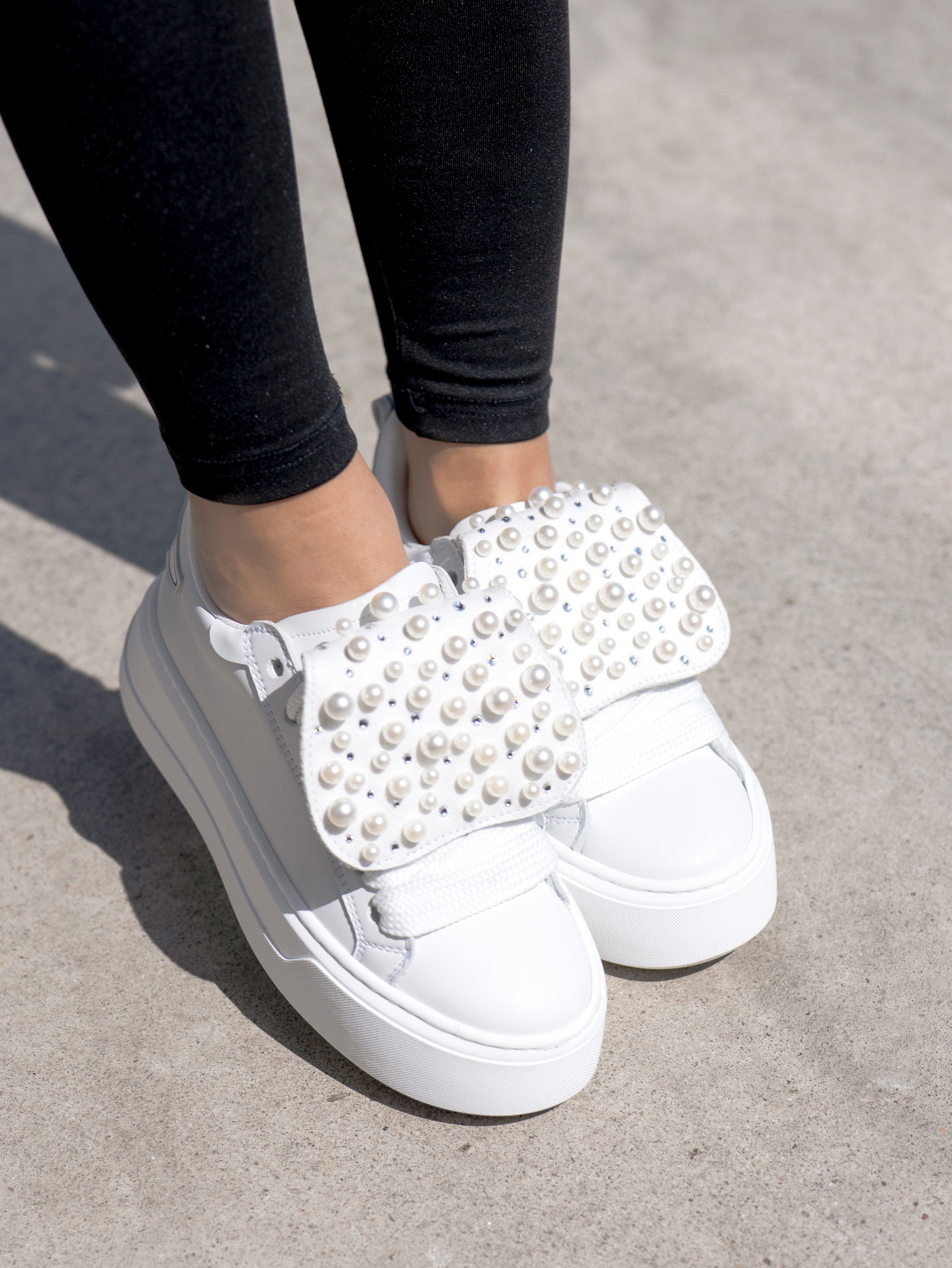 Il cuore del design è la sua linguetta removibile, un accessorio raffinato impreziosito da perle luminose e strass scintillanti, che trasforma la scarpa in una dichiarazione di stile. Quando desideri un look più essenziale, ti basta rimuoverla: otterrai così una sneaker total white pulita e versatile, perfetta per accompagnarti in ogni momento della giornata.