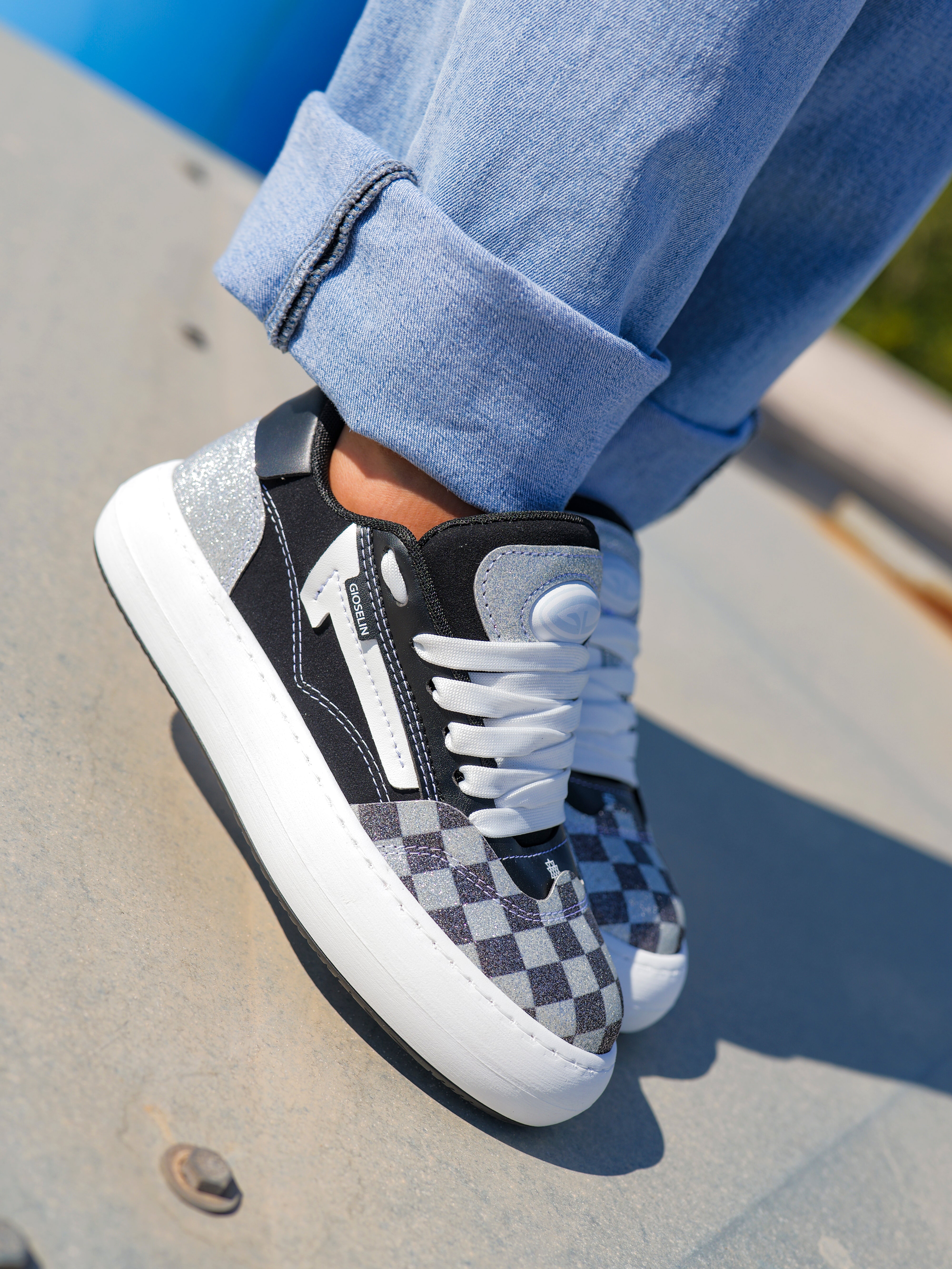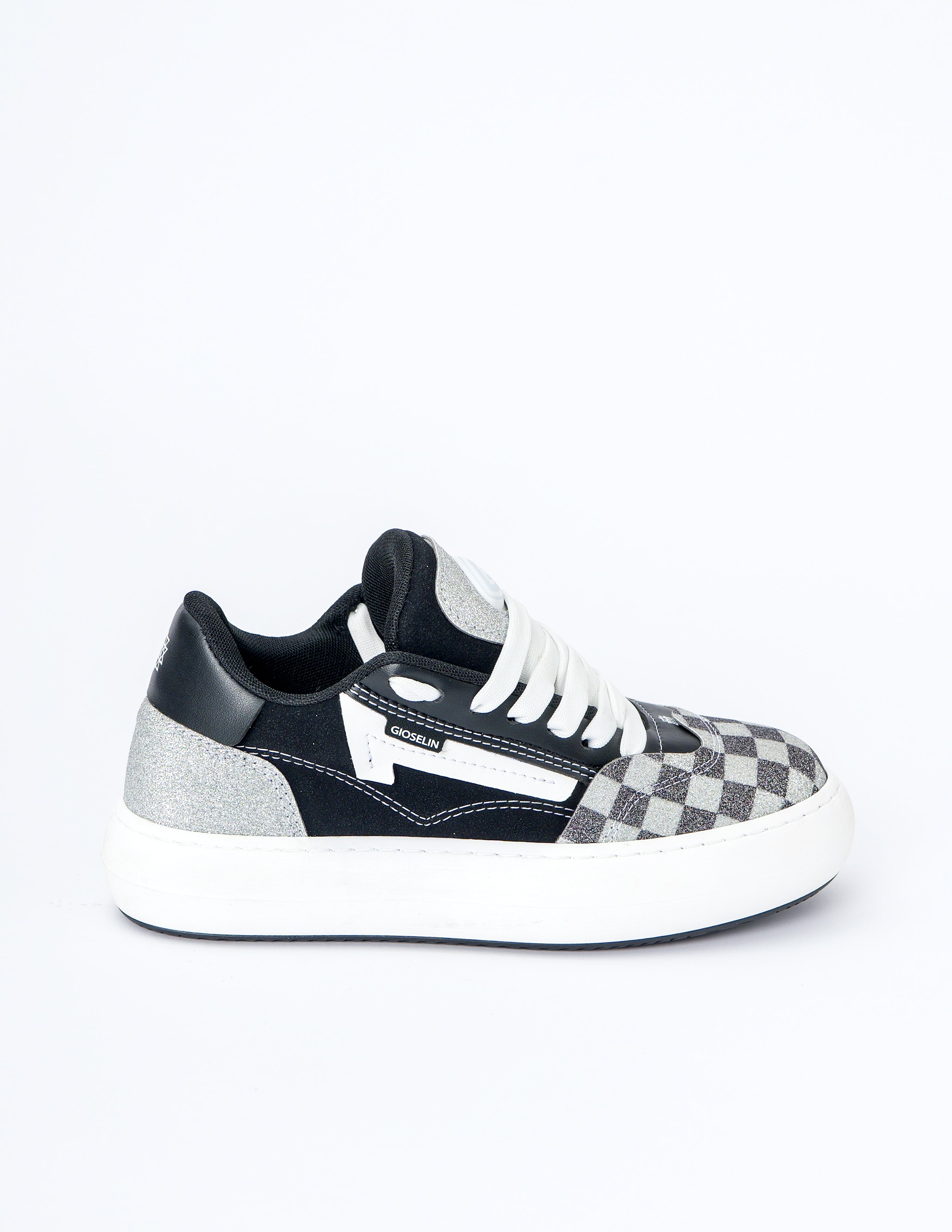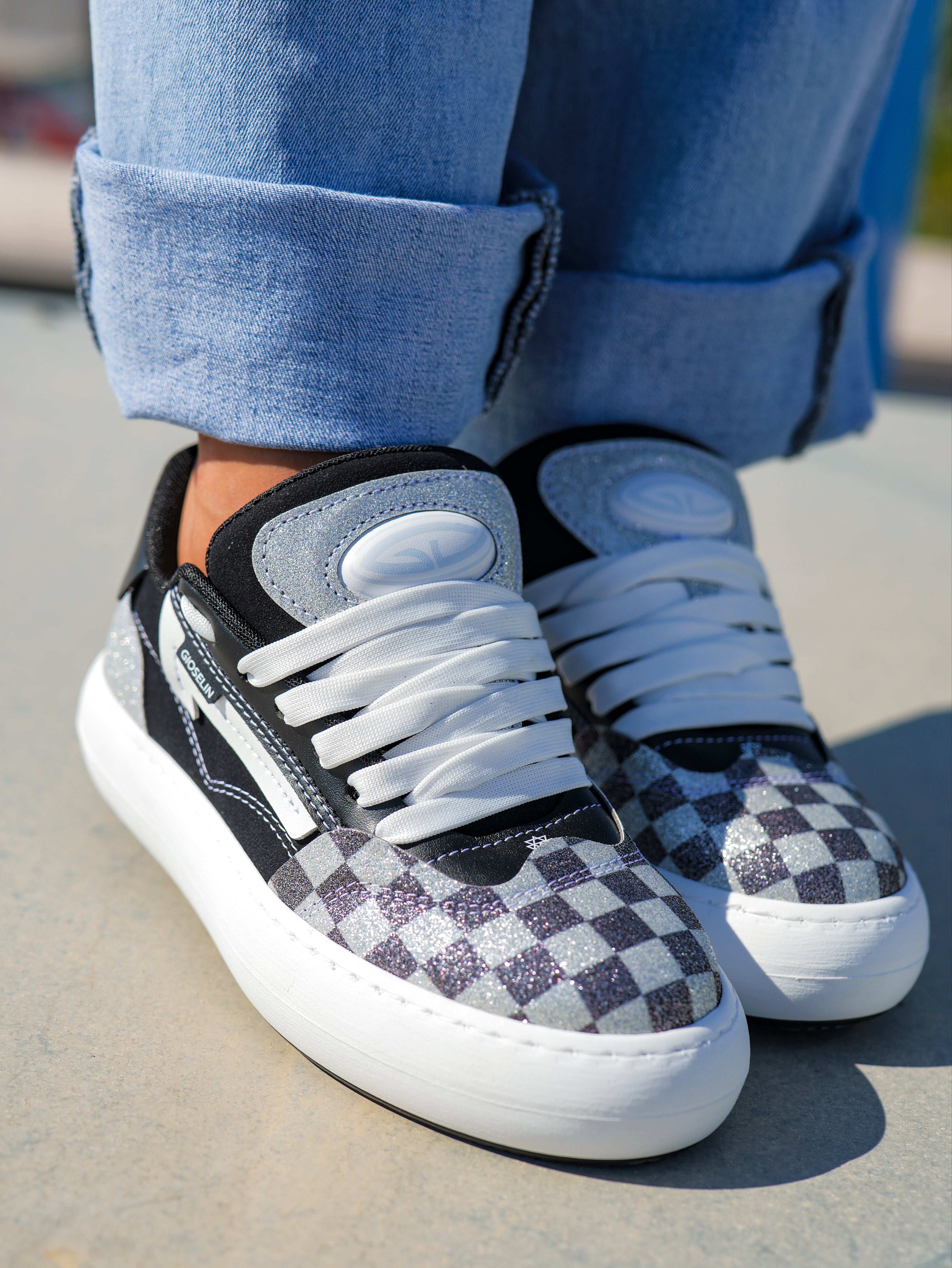 Immergiti in una galassia di stile con SLIDE Galaxy, la sneaker che unisce leggerezza assoluta a un’estetica fuori dal comune. Il pattern a scacchi in glitter argento e nero con riflessi violacei ricorda un cielo stellato in movimento: dinamico, magnetico, ipnotico.