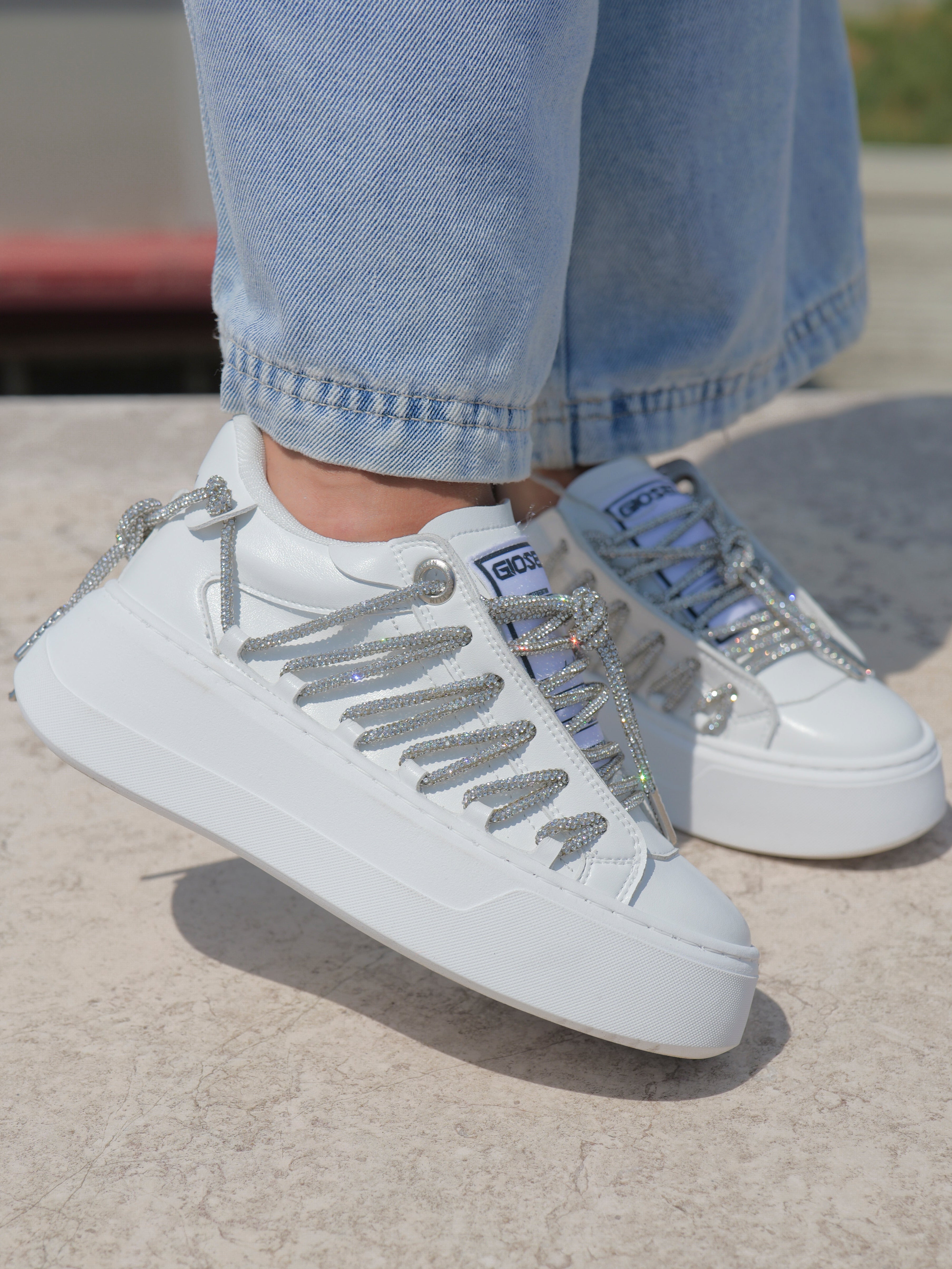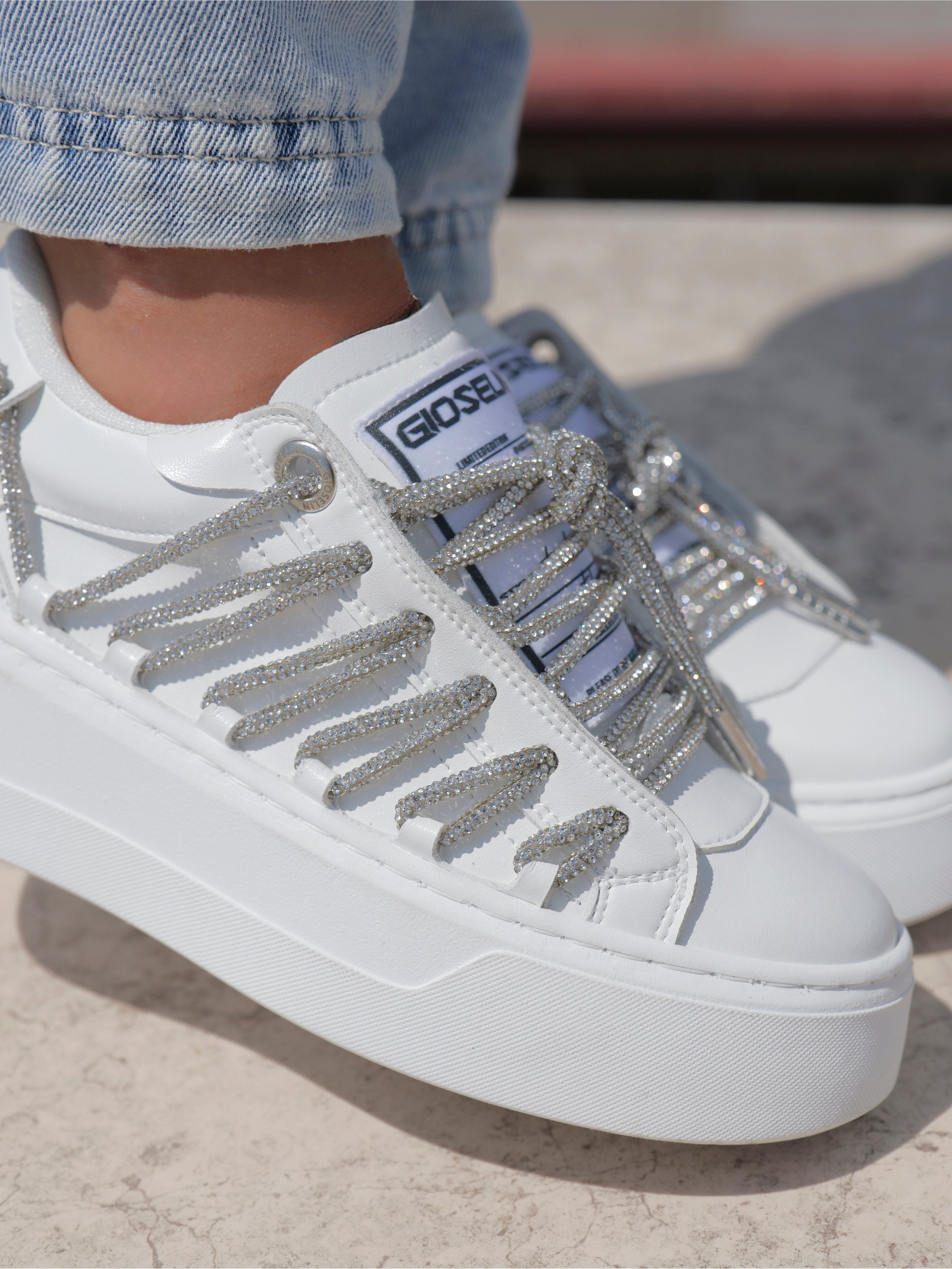 Il suo punto forte? I lacci Diamond, interamente ricoperti da strass silver che catturano la luce e trasformano ogni passo in uno spettacolo di riflessi. Dettagli brillanti che non passano inosservati, capaci di rendere unico anche il più semplice dei look.
