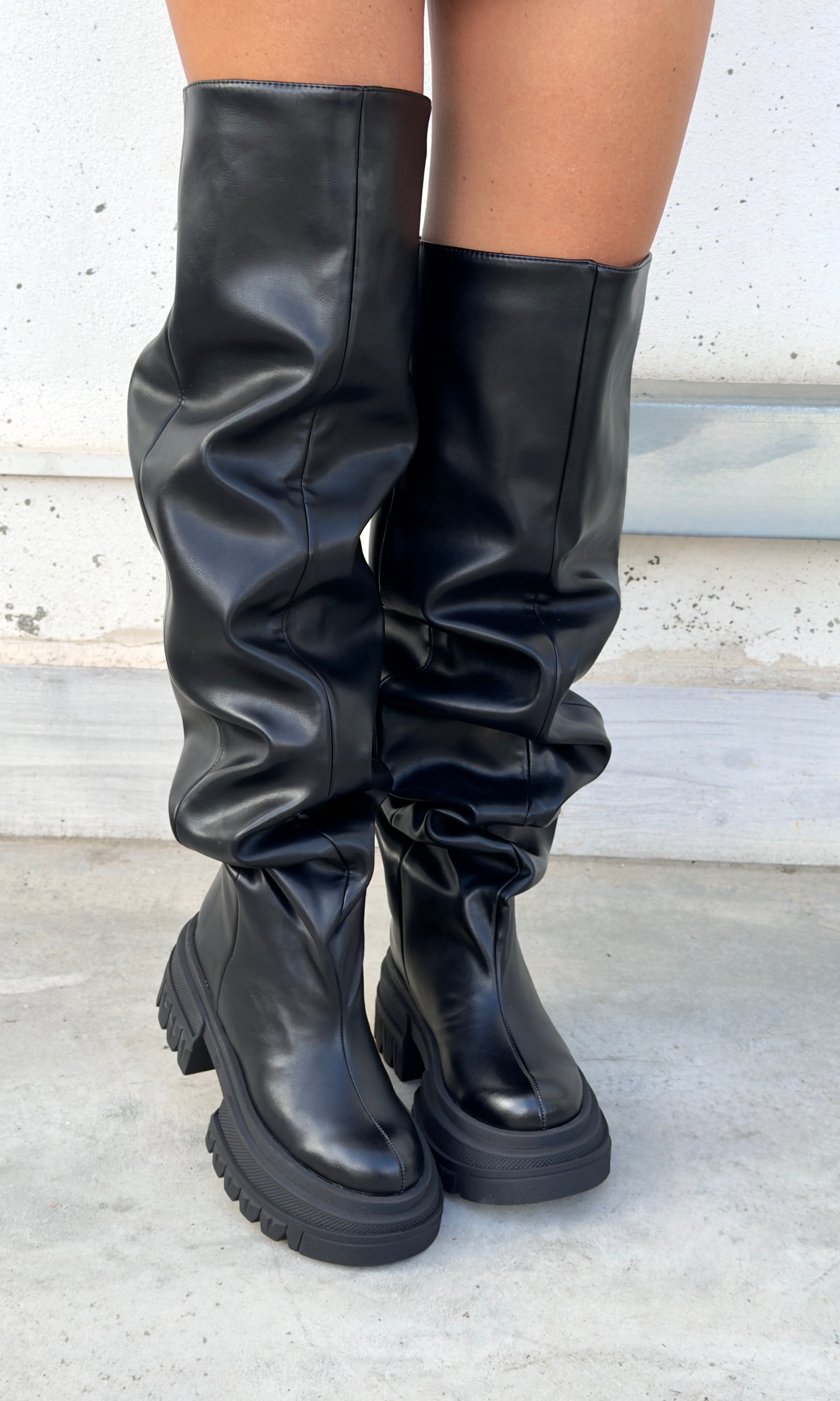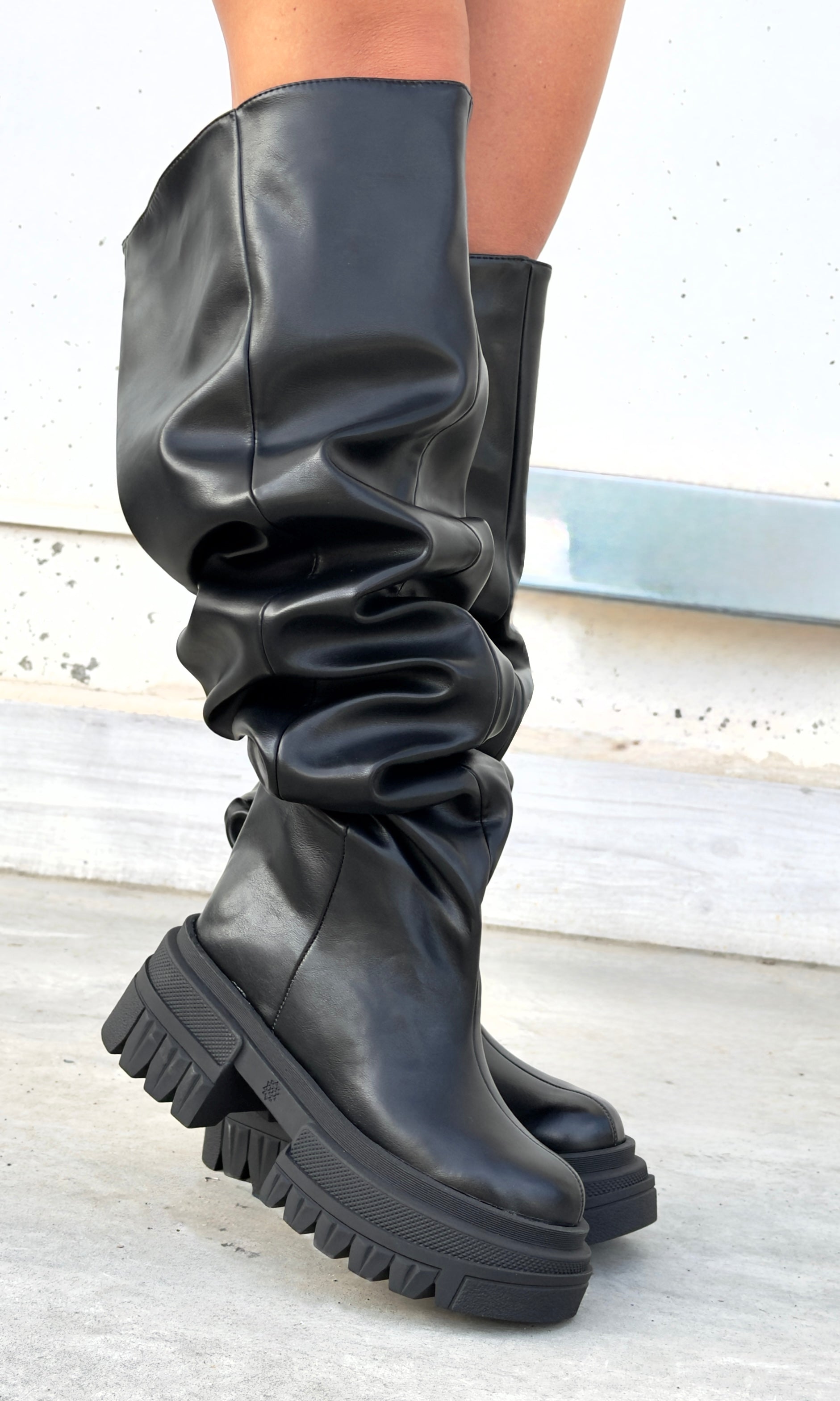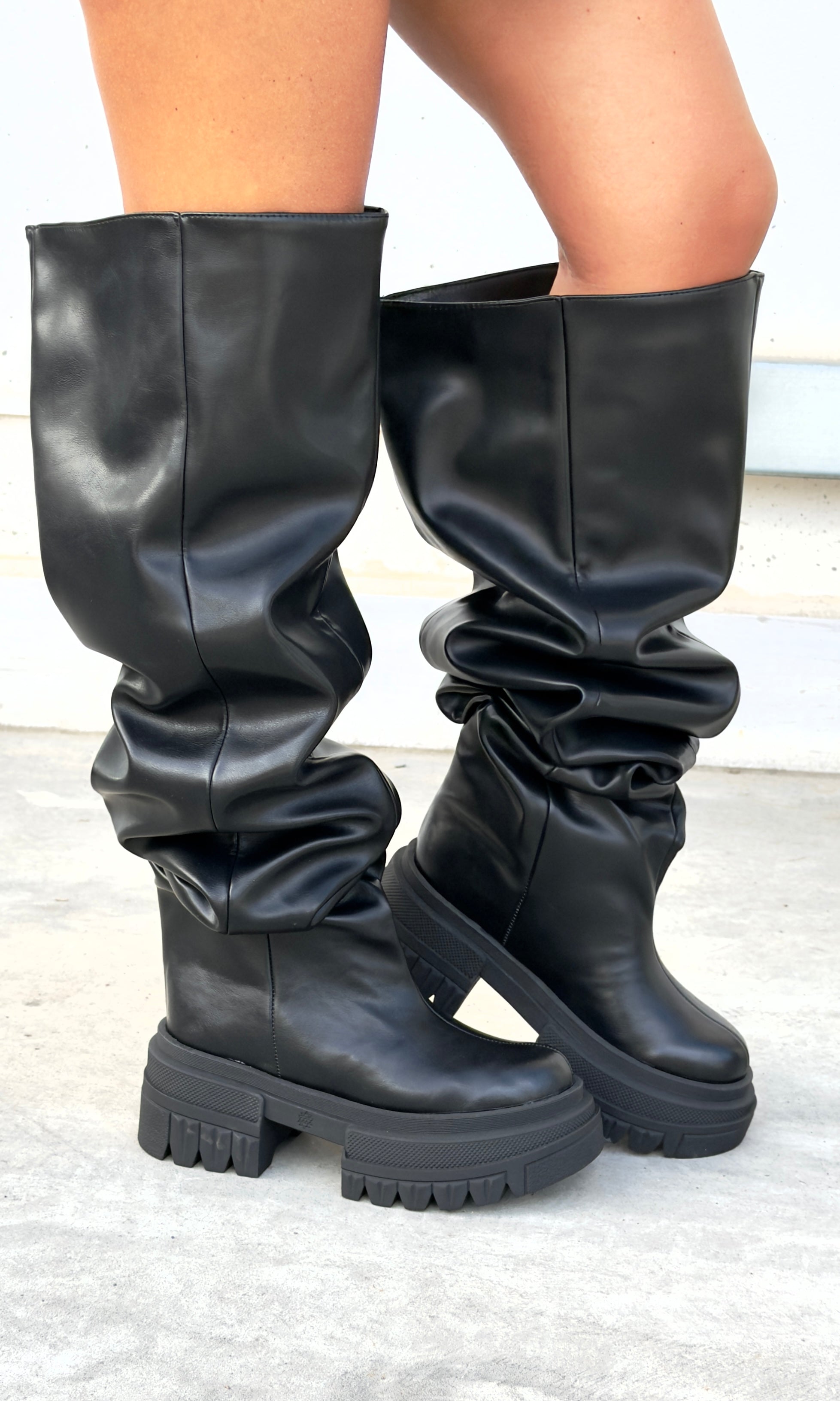 Realizzato in pelle nera di alta qualità, con punta arrotondata e suola chunky dentellata, con altezza importante, unisce comfort e grinta in un unico modello. La vestibilità slouchy del gambale rende questo stivale protagonista assoluto di ogni outfit, perfetto per chi cerca una calzatura che non sia solo un dettaglio, ma il fulcro del look.
