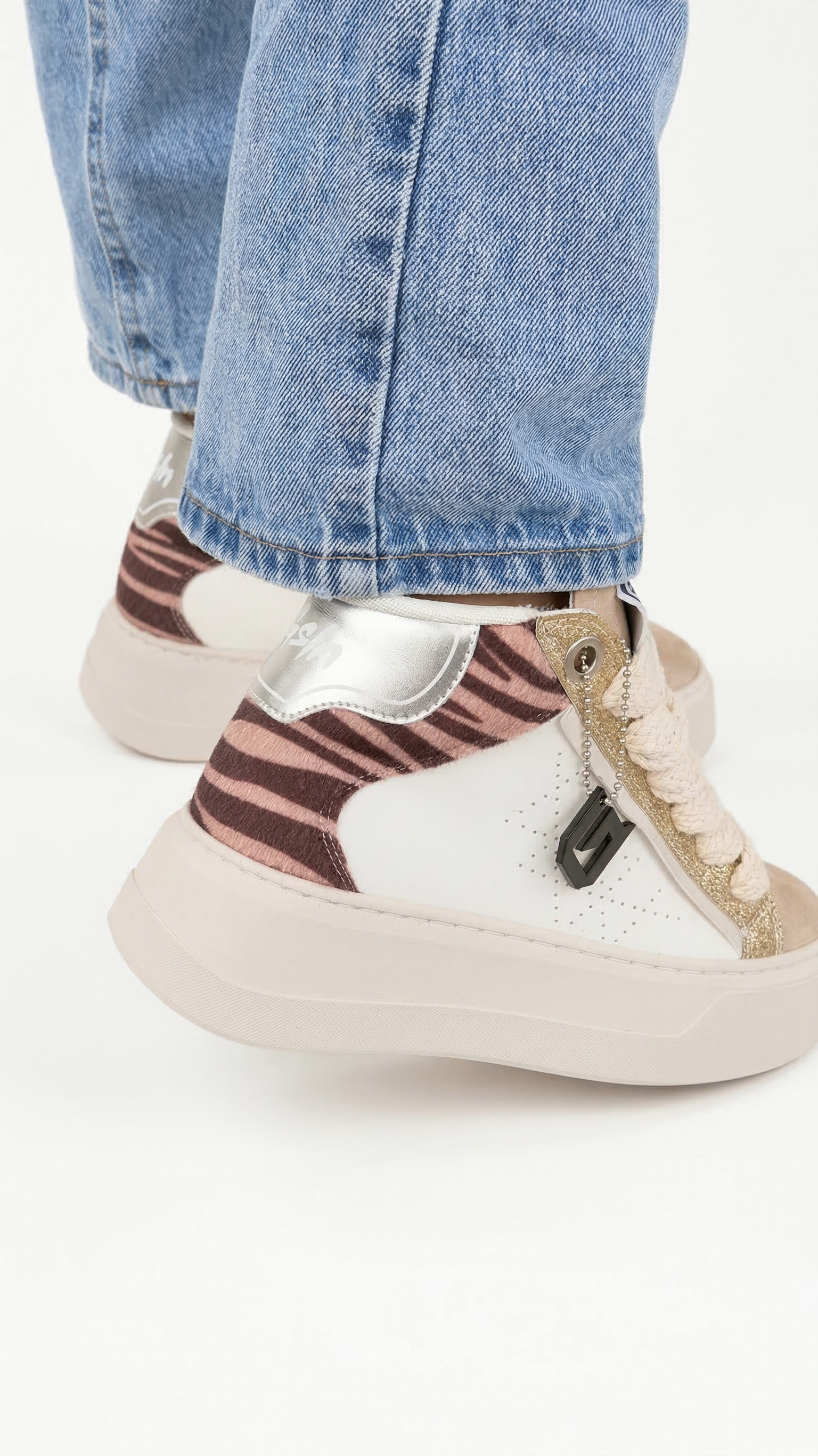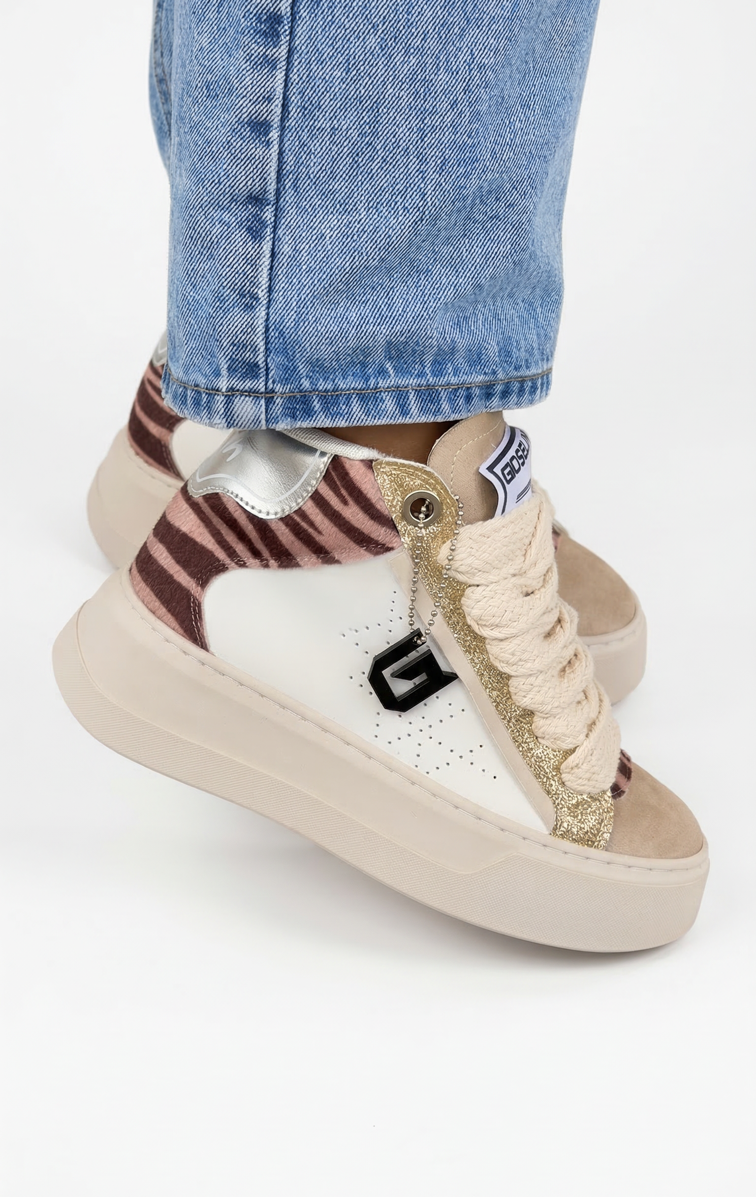 Il modello si distingue per il suo mix di materiali e texture sofisticate. L’inserto frontale in glitter gold luminoso dona alla scarpa un effetto brillante e glamour, mentre il dettaglio animalier nelle tonalità rosa e bordeaux sul tallone aggiunge personalità e carattere. La punta in suede beige crea un contrasto elegante e raffinato, rendendo la sneaker ancora più esclusiva.