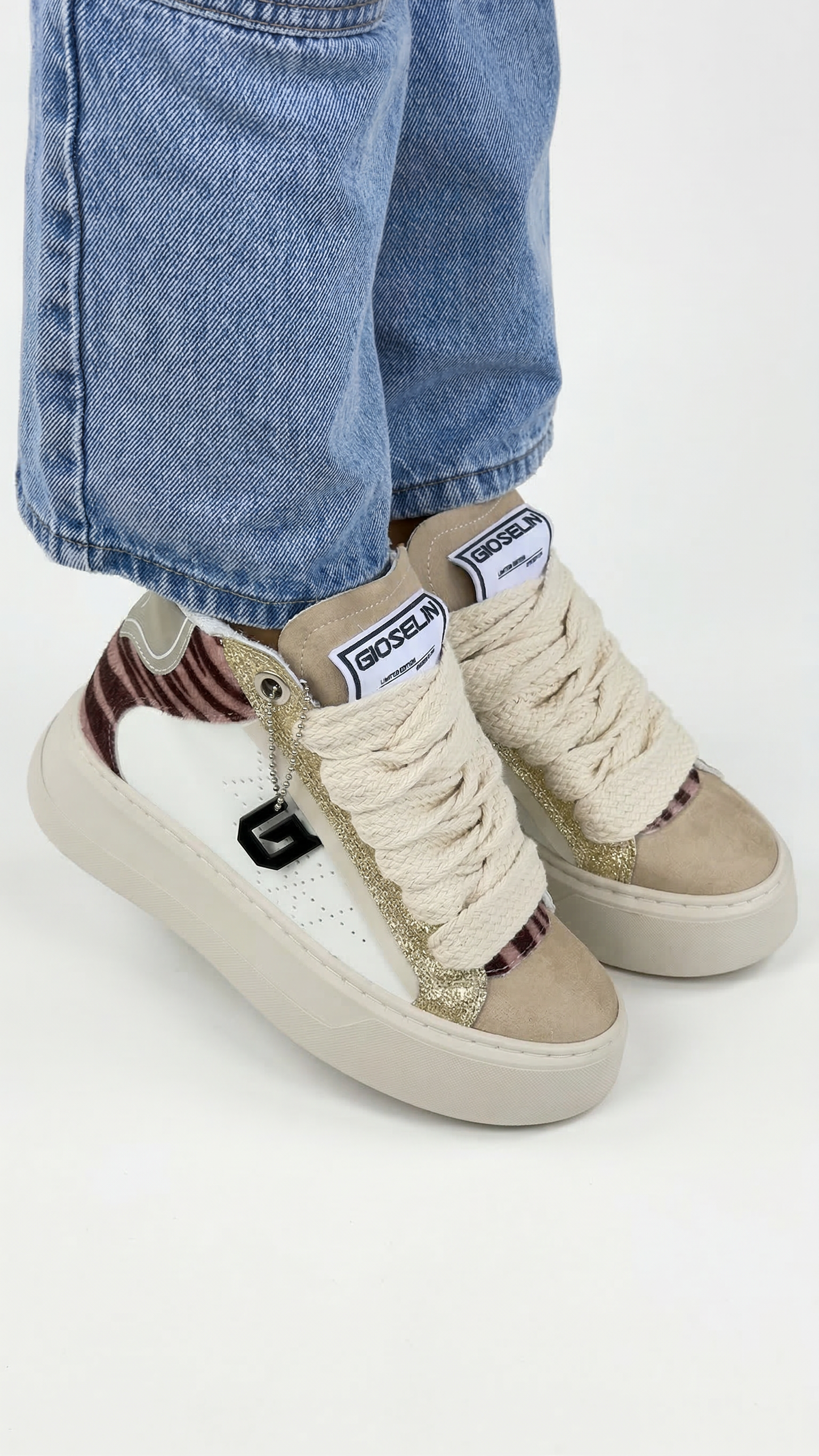 ✨ Inserto glitter gold: Un dettaglio luminoso e glamour che rende la sneaker elegante e di forte impatto visivo.