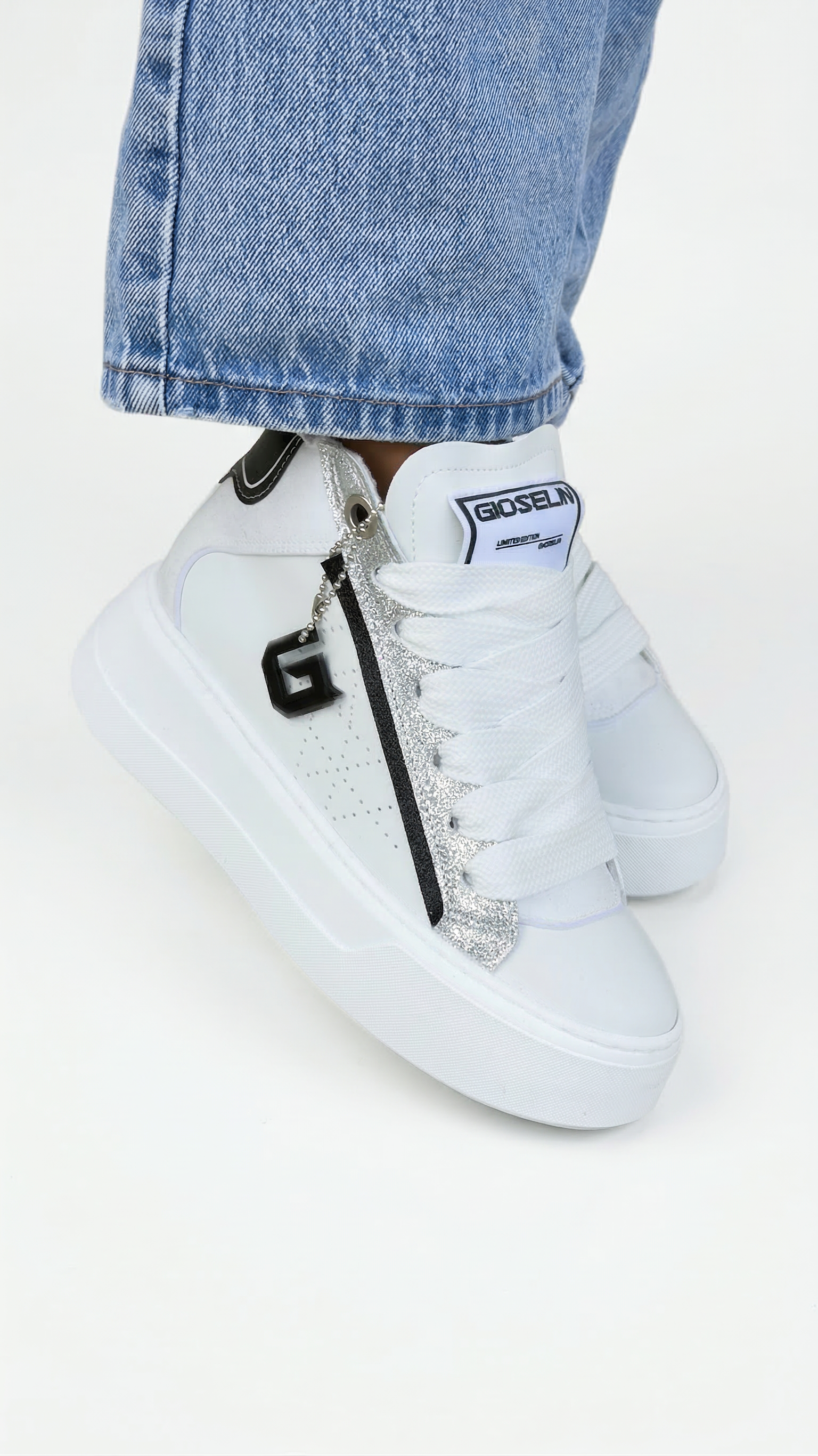 Inserto glitter silver: Un dettaglio luminoso e raffinato che rende la sneaker elegante e di forte impatto visivo.