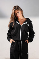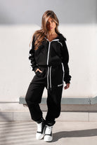 Sulla parte frontale, la tuta presenta il logo Gioselin ricamato sia sulla felpa sia sul pantalone, per un’identità di brand pulita e raffinata.