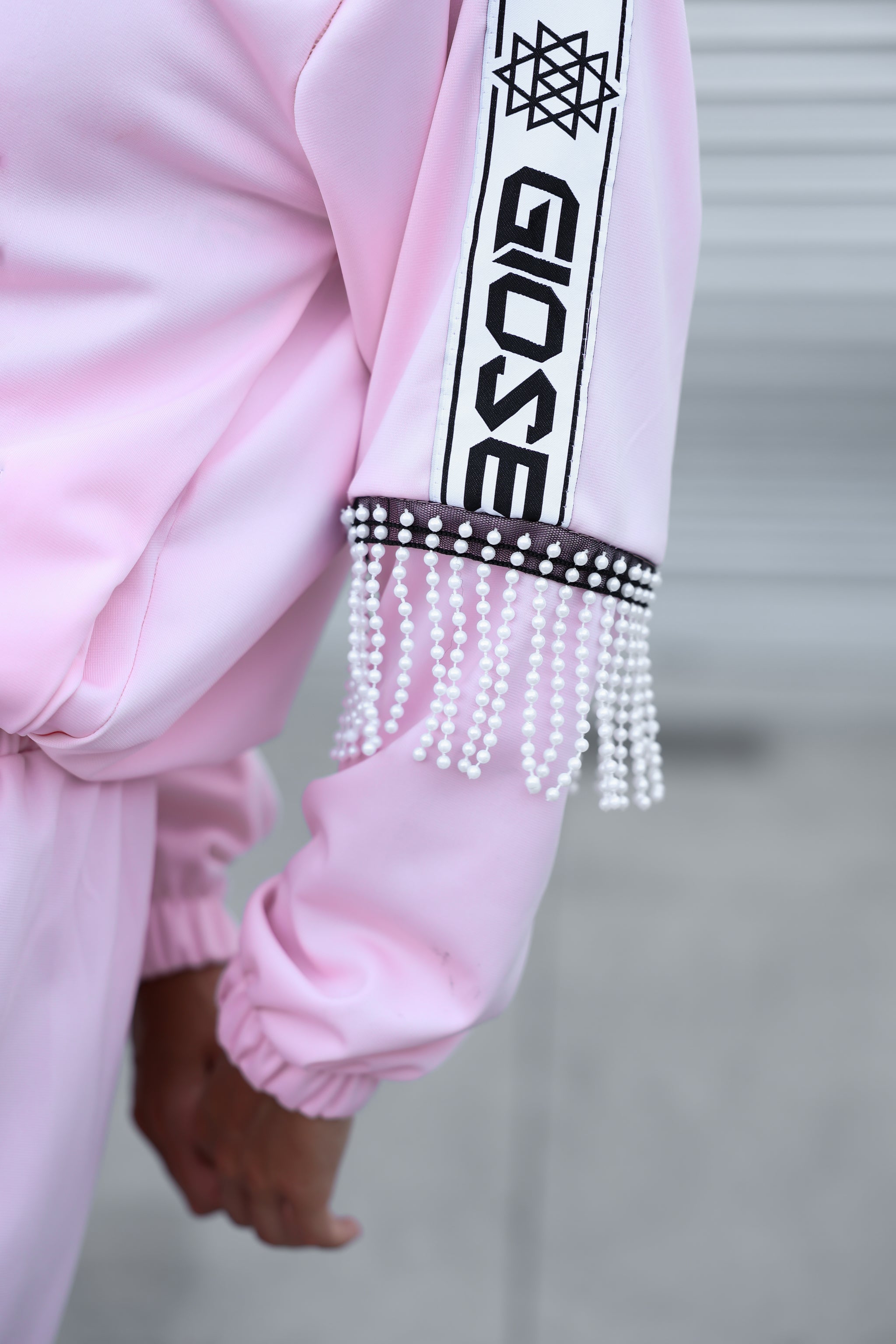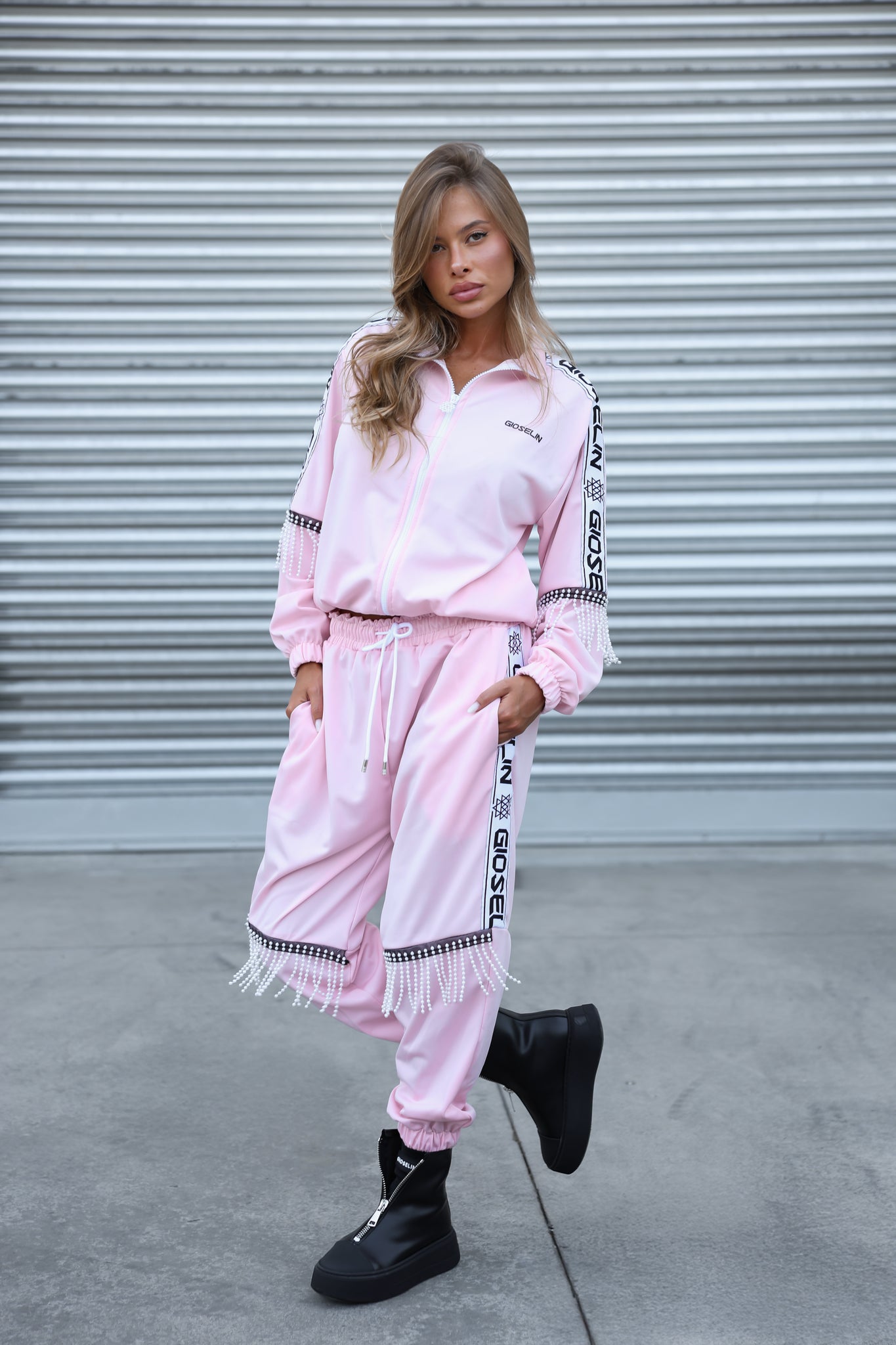 Il completo – venduto insieme – include una giacca zip con profili logati GIOSELIN su maniche e pantaloni, arricchita da un dettaglio esclusivo: frange di perle applicate a mano che ondeggiano ad ogni passo, catturando la luce e l’attenzione. Un tocco prezioso che la rende unica, proprio come chi la indossa.