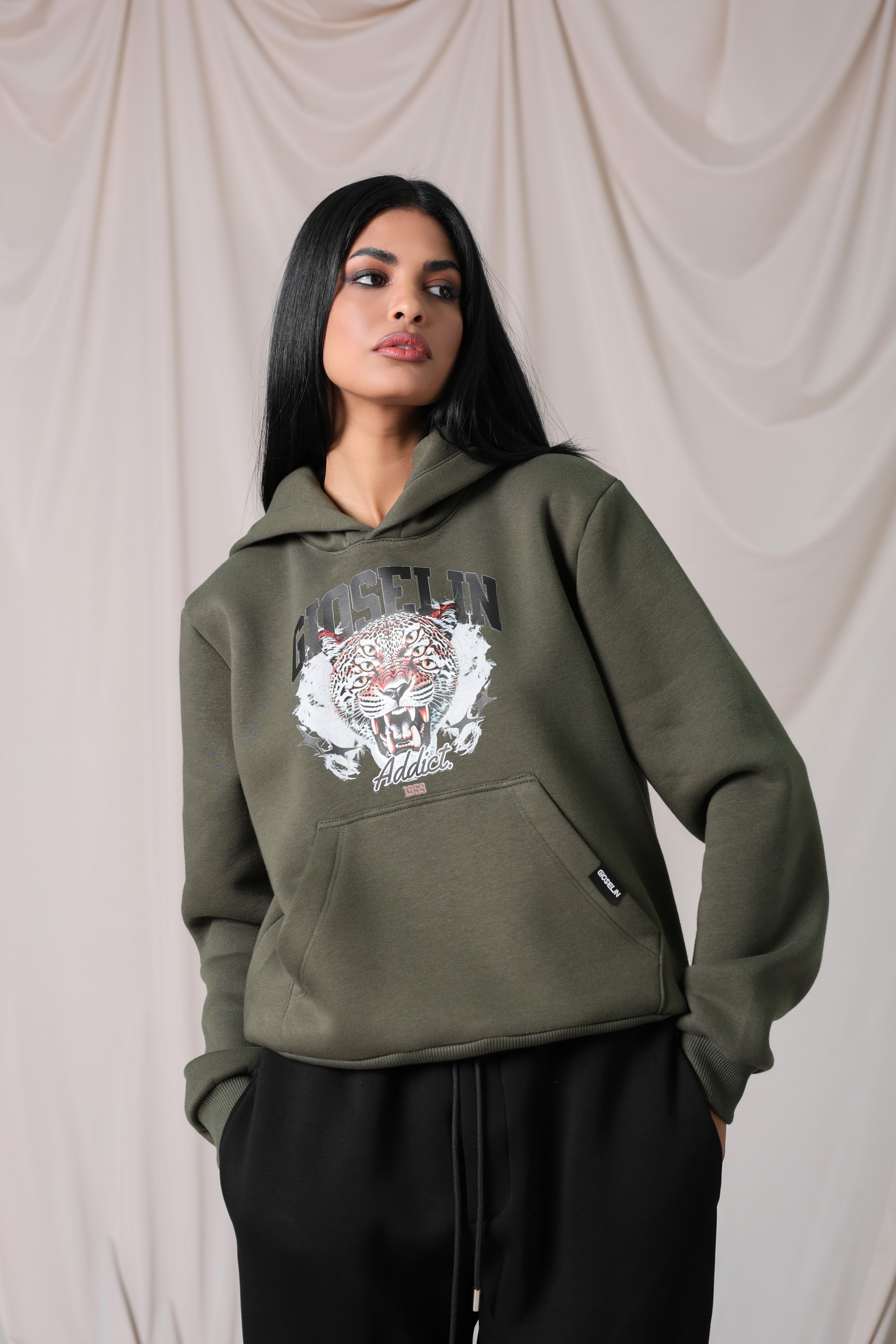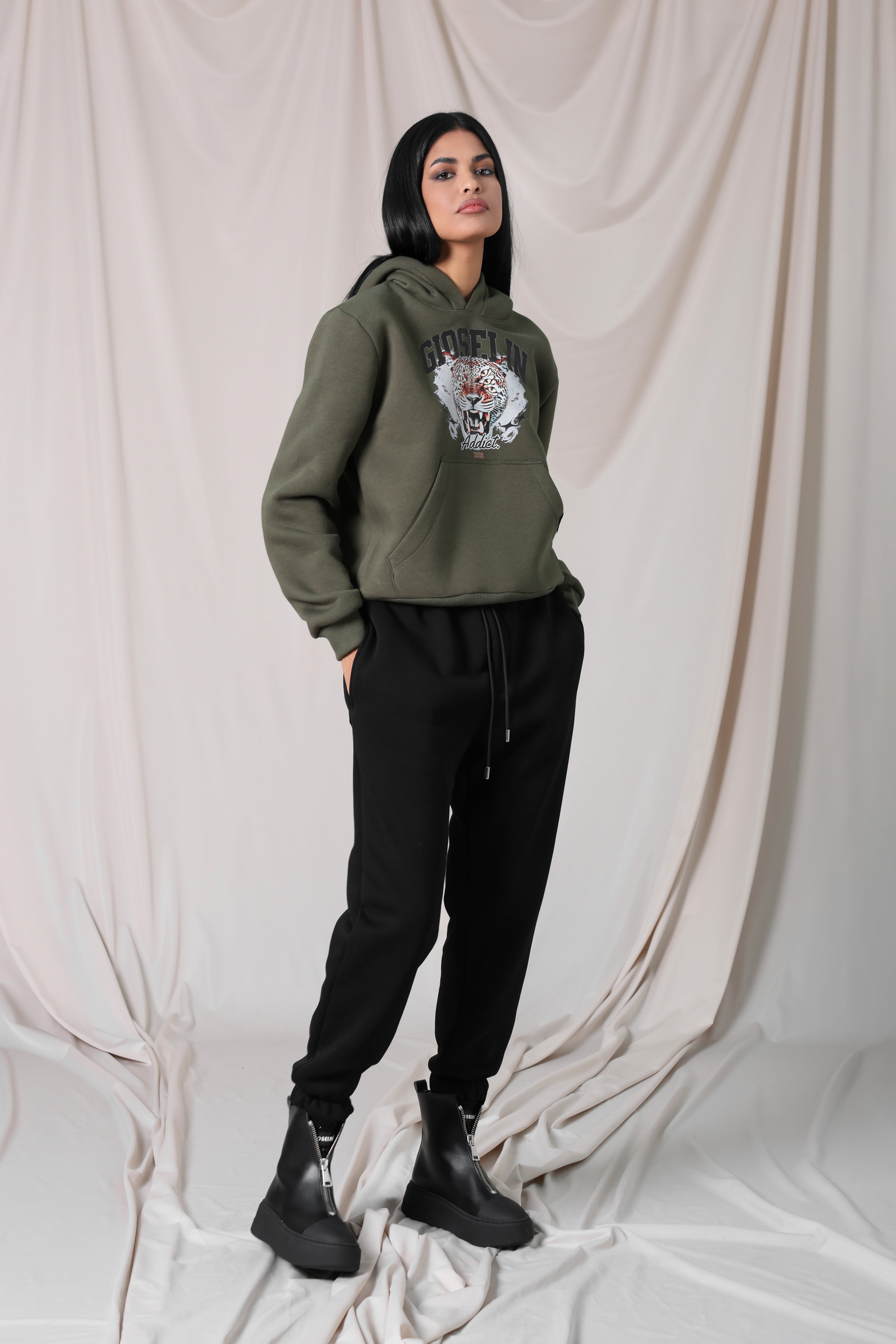 La felpa, con cappuccio e fascia elastica in vita, è valorizzata dal logo Gioselin e dalla grintosa fantasia tiger che dona un tocco selvaggio e fashion. Il pantalone, con elastico in vita, garantisce praticità e vestibilità dinamica, perfetta per un look urban.